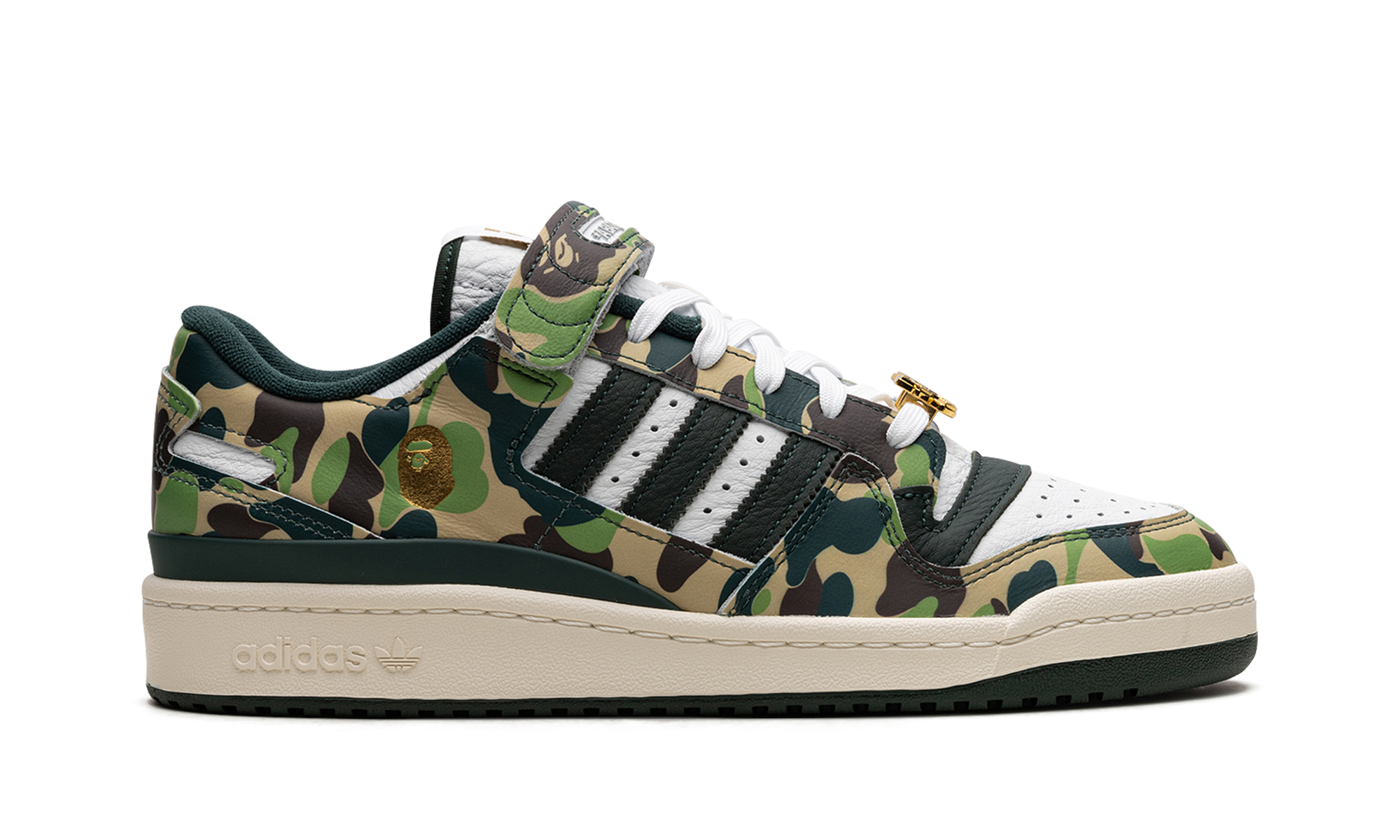 The BAPE x adidas Forum ‘84 Low “30th Anniversary - Green Camo” is a collaboration by the Japanese streetwear brand on the retro basketball shoe that honors BAPE’s 30th anniversary. Founded by legendary streetwear designer Nigo in 1993, BAPE is widely considered among the most influential clothing brands in the world. Its collaboration with adidas on the Forum ‘84 Low celebrates its three-decade existence. The shoe features BAPE iconic green camouflage print in an all-over pattern on the overlays while white leather is found on the base. Black Three Stripes branding appears on the side. A gold “APE” logo is displayed on the lateral side of the heel while an oversized gold “BAPE” dubrae is located at the bottom of the laces. BAPE’s 30th anniversary branding can be seen on the tongue. Release date: May 20, 2023
