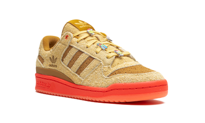 The adidas Forum Low "The Grinch - Max" is a colorway of the retro basketball shoe inspired by the dog of the same name who appears in “The Grinch.” Known as The Grinch’s only friend and partner in crime in the Dr. Seuss story, Max is immortalized on the classic basketball sneaker as part of the model’s holiday-themed collection of “The Grinch” colorways. The shoe features a hairy suede upper in shades of brown and tan inspired by the color of Max’s fur. A graphic of Max’s eyes appears on the left shoe’s tongue tag while an adidas logo is found on the right, and special lace accoutrements inspired by the Max and The Grinch are seen on the laces.