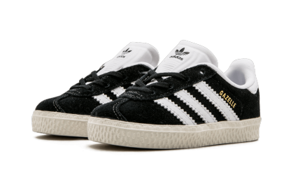 These infant Gazelle sneakers from adidas are crafted with a black suede upper and feature the iconic 3 stripes branding in white. The design is completed with gold Gazelle lettering on the side and a white sole.