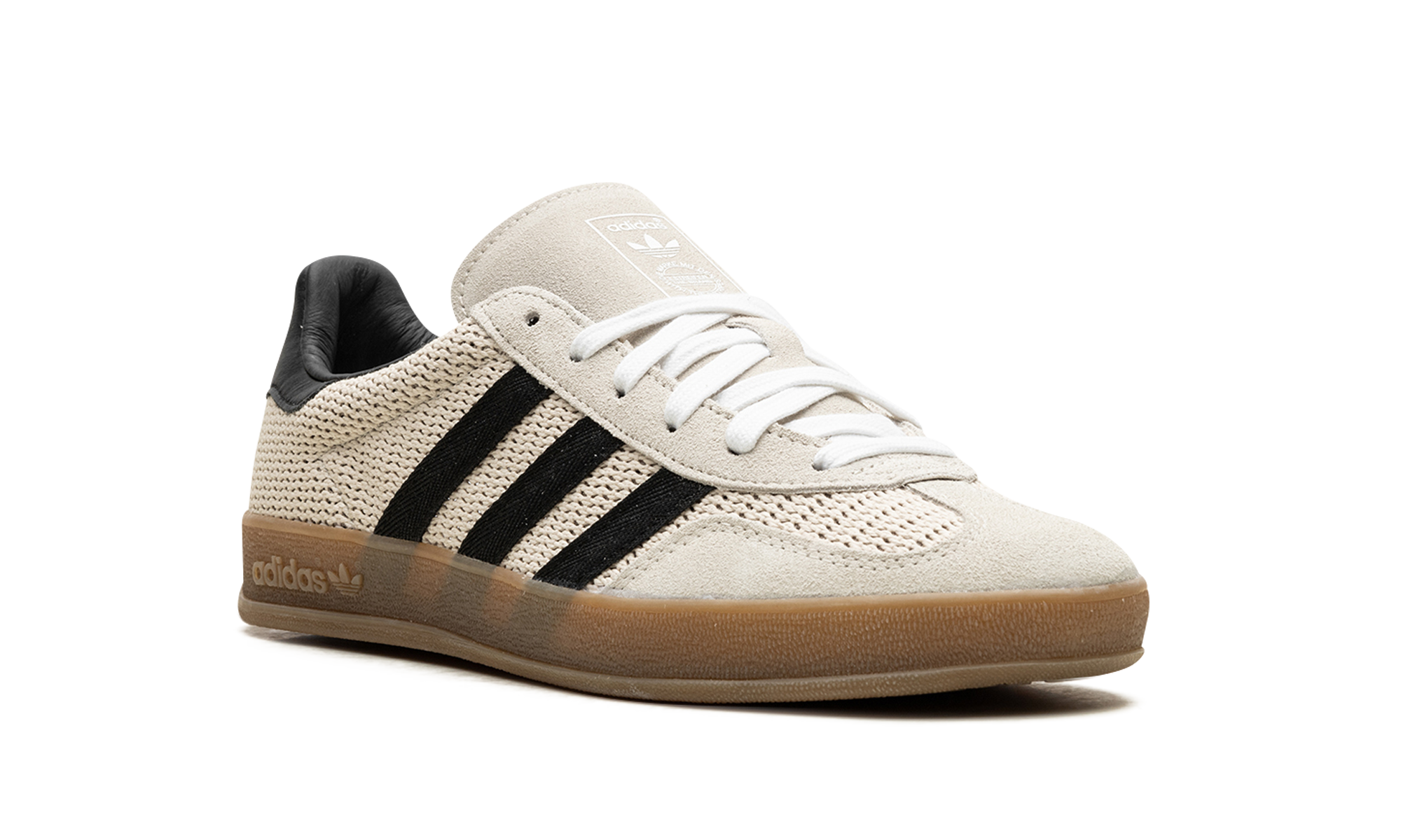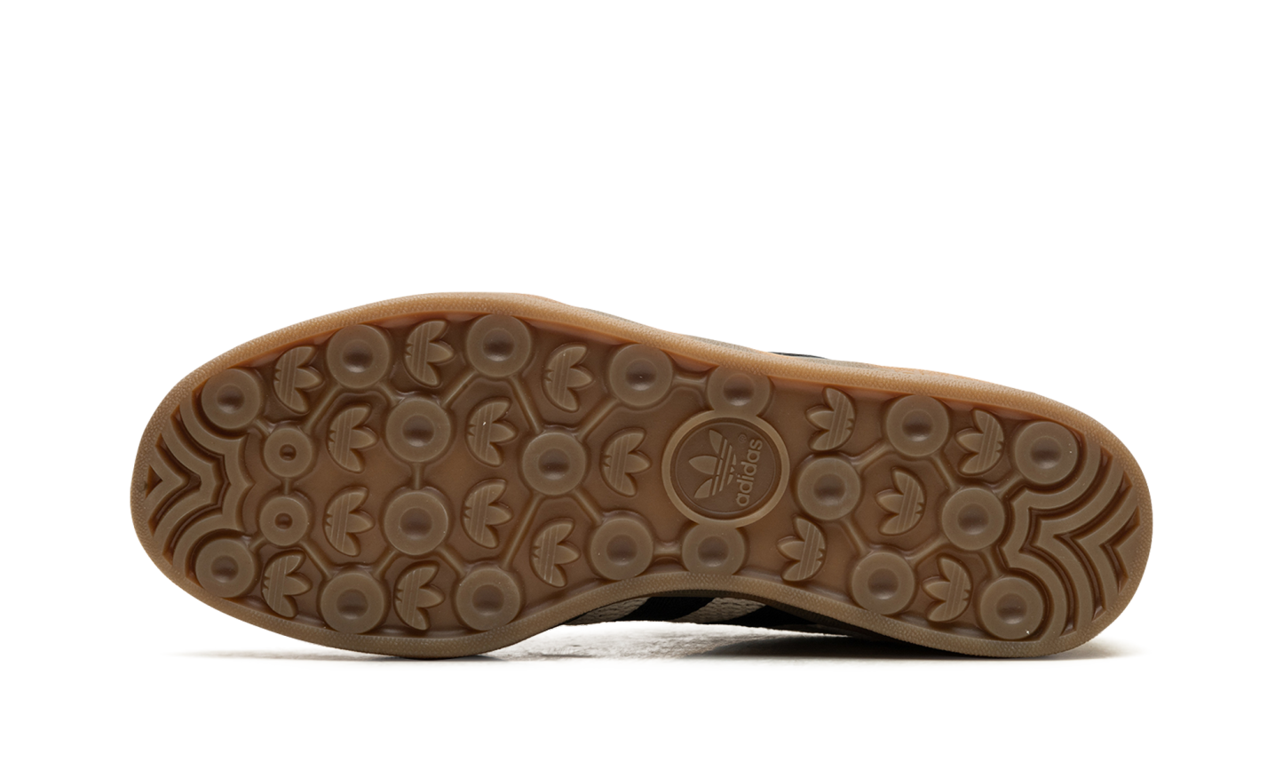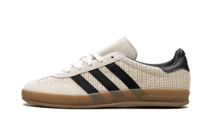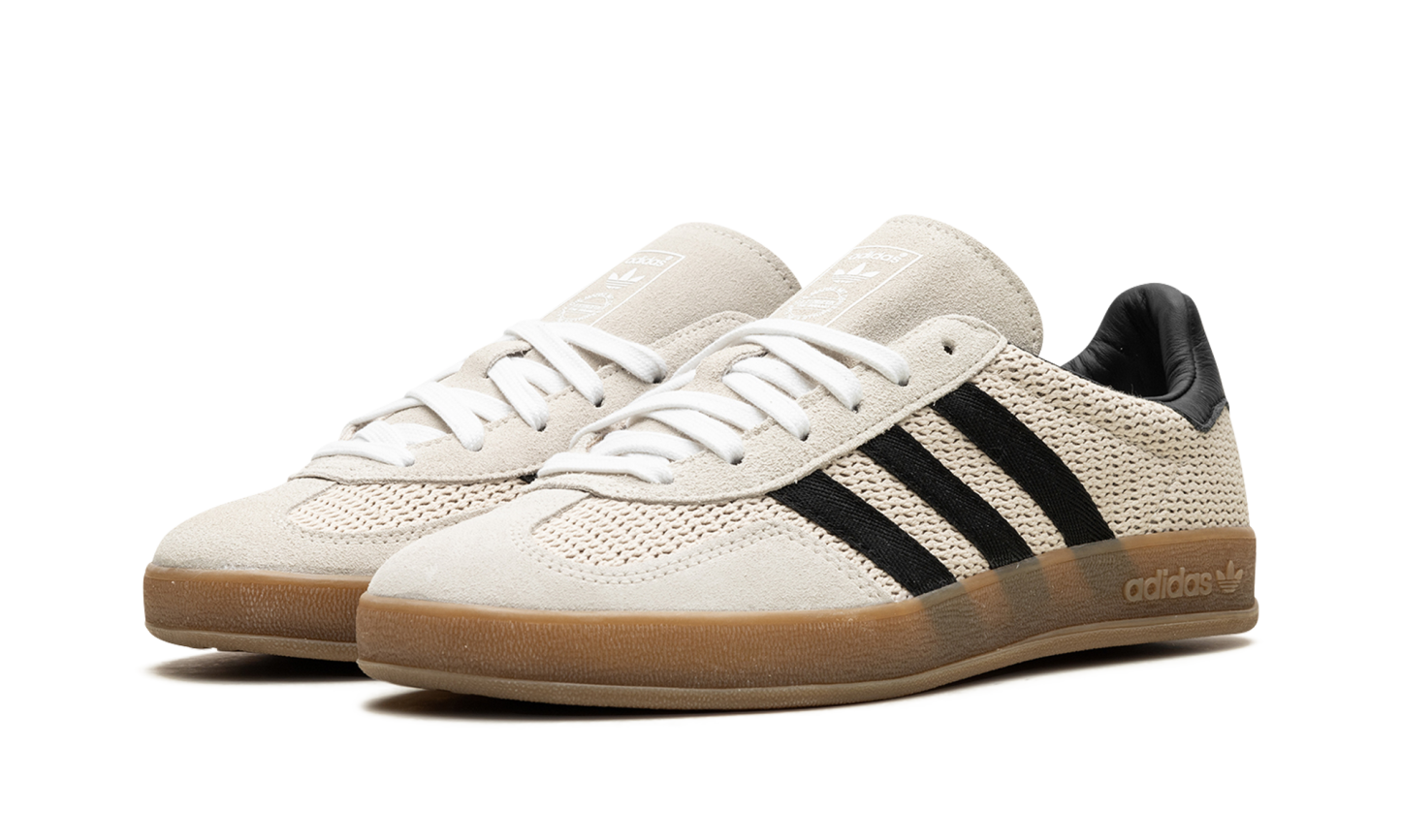 The adidas Gazelle Indoor "Aluminum Core Black" modernizes a classic with earthy tones and updated materials. Beige cotton mesh forms the upper, accented by suede overlays. Black nylon stripes and leather details provide sharp contrast. Classic Trefoil branding remains, honoring the shoe's retro roots. An Ortholite sockliner ensures comfort, while a gum outsole delivers reliable traction. This iteration blends vintage style with contemporary updates, offering a sleek, versatile look. It balances comfort and style, making it suitable for both casual wear and indoor activities.