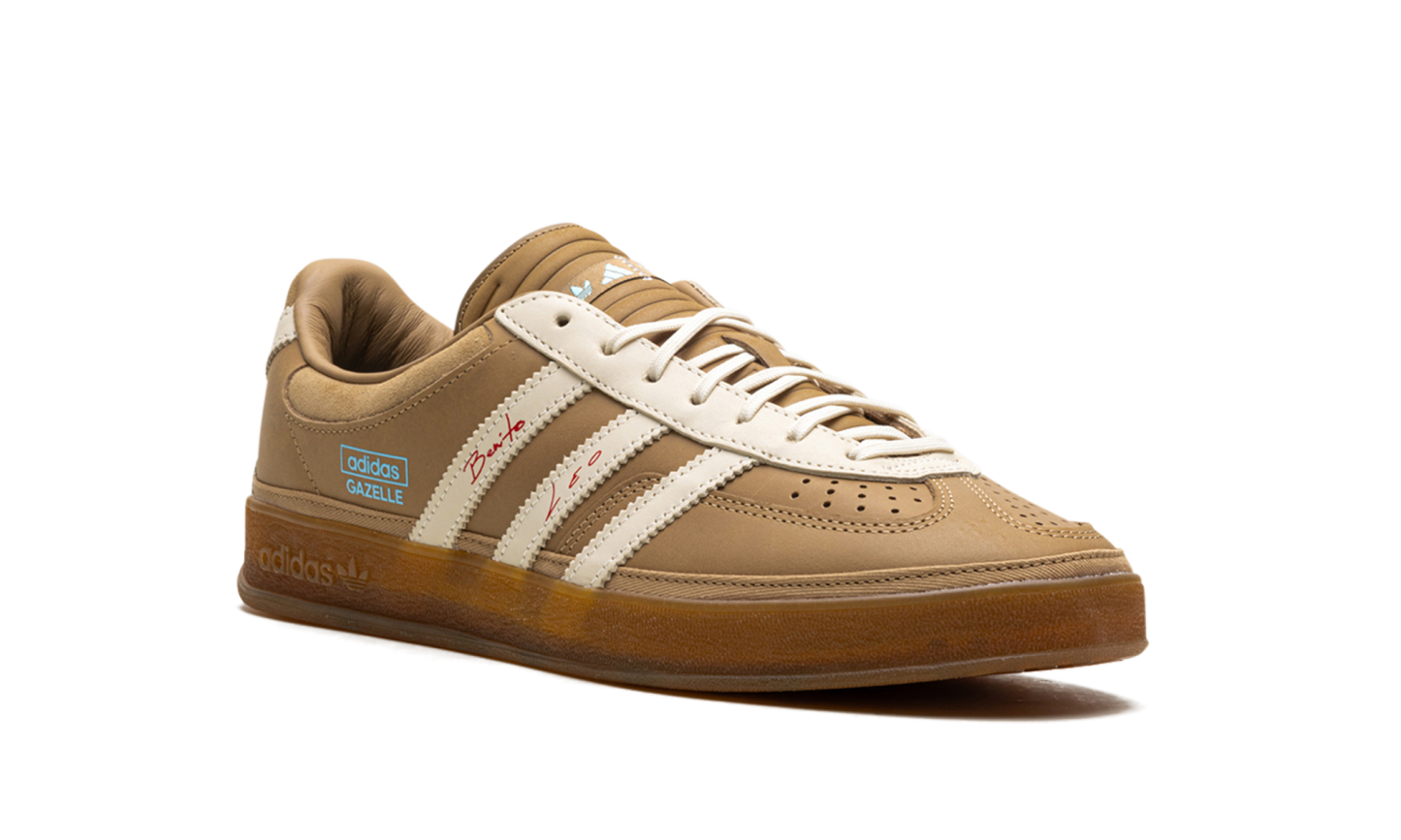 Watch music and soccer worlds collide with the Adidas Gazelle Indoor Bad Bunny x Lionel Messi 'Cardboard,' the ultimate "Icon Clash" sneaker. This premium edition features a rich, tan leather upper with soft suede overlays and a signature warped T-toe, nodding to Bad Bunny's unique aesthetic. Red "Benito" and "Leo" signatures adorn the iconic Three Stripes, while an "X" shape on the heel references Messi’s jersey number 10. A translucent gum sole completes this collector's must-have.