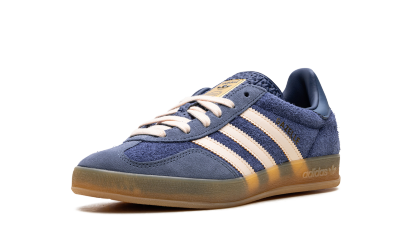 Step back into classic style with the adidas Gazelle Indoor "Dark Blue Suede." A faithful recreation of the 1979 indoor model, this shoe features a luxurious Dark Blue suede upper contrasted by sharp white or light-colored serrated Three-Stripes and heel tab. The most defining feature is the translucent gum rubber cupsole, which has a distinctive pattern and gives the sneaker its original vintage indoor look and feel. Gold foil "Gazelle" branding on the side and the Trefoil logo on the tongue complete this timeless, retro silhouette.