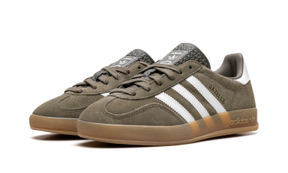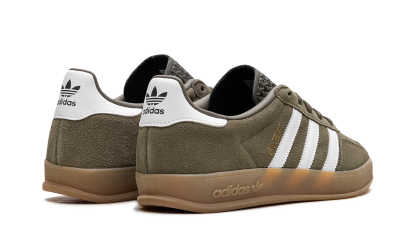 The Adidas Gazelle Indoor in "Olive Strata Cloud White Gum" is a men's sneaker that reinterprets the classic low-profile silhouette with an indoor football aesthetic. It typically features a premium suede upper in Olive Strata, contrasted by Cloud White on the Three Stripes and heel tab. The shoe is finished with a signature translucent Gum rubber outsole, which reinforces its vintage, court-inspired style.
