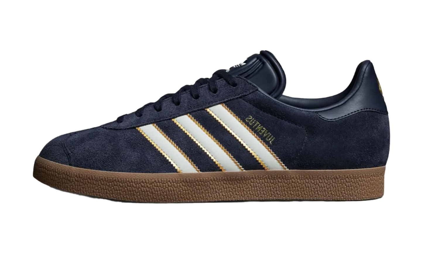 Show your team loyalty with the Adidas Gazelle "Juventus Terrace Icons," a collaboration that honors the "Football Casual" aesthetic. This classic shoe boasts a luxurious Legend Ink (navy) suede upper with off-white serrated Three Stripes accented by gold detailing. Special team graphics and "JUVENTUS" lettering replace the standard Gazelle branding, connecting the timeless silhouette to the club's 80s history. A durable rubber outsole completes this pitch-to-pavement favorite for devoted fans.