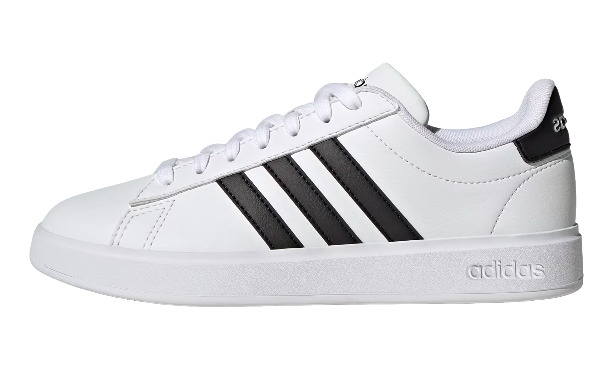 The Adidas Grand Court WMNS in the classic Cloud White Core Black colorway is a court-inspired sneaker for women that blends retro design with everyday comfort. It features a clean, durable synthetic leather upper, making it an easy-to-maintain, classic tennis silhouette. The shoe offers cushioning for all-day wear and has a rubber outsole for reliable traction. Its black and white color scheme, accentuated by the signature three stripes, makes it a versatile, iconic staple for casual, everyday styling.