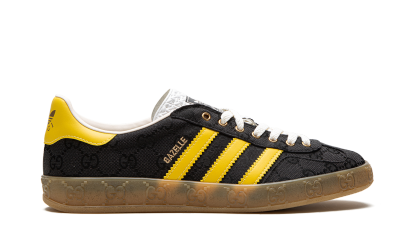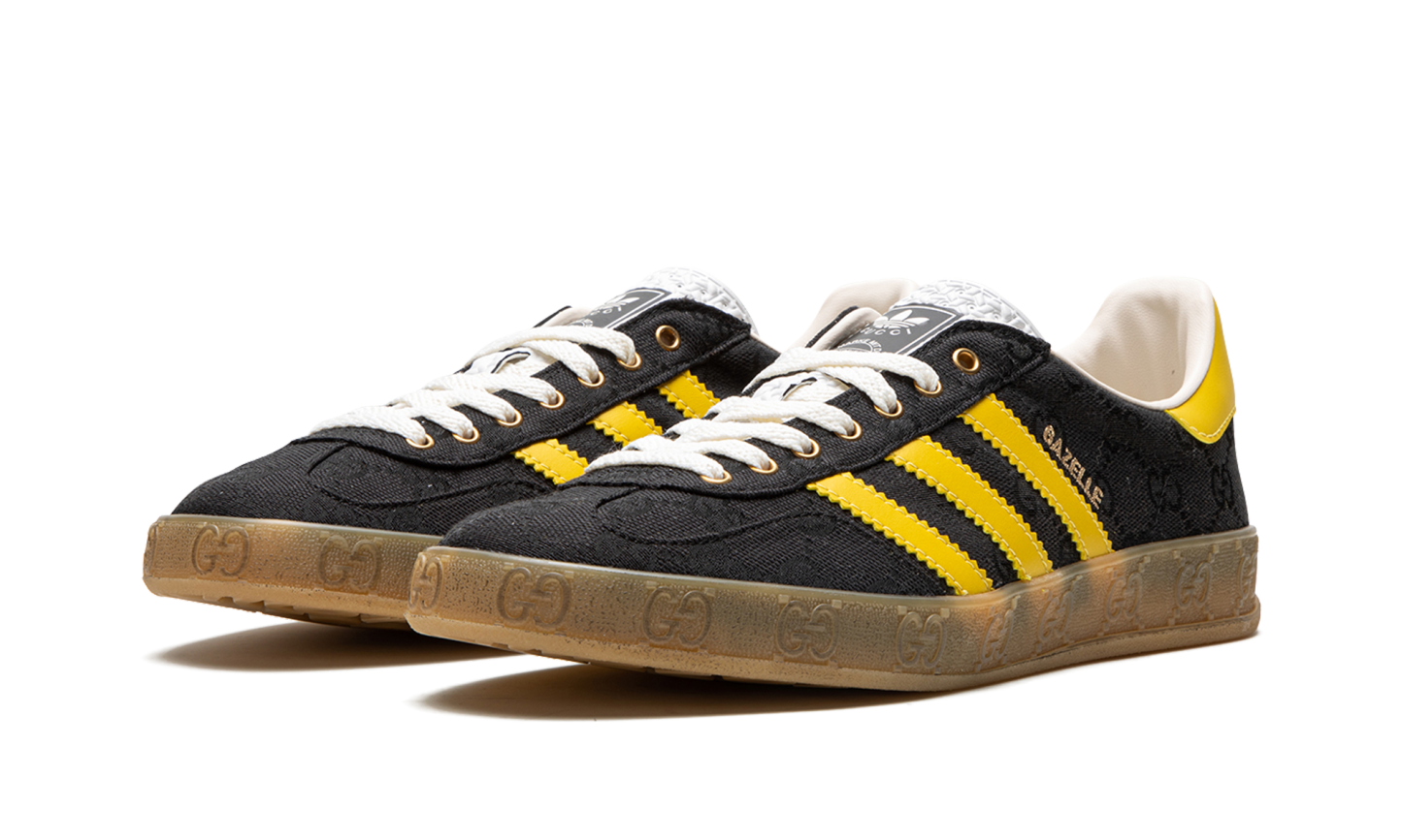 The Gucci x adidas Gazelle “Black/Yellow” is one of several limited edition colorways of the retro shoe from the collaboration between the legacy high fashion brand and adidas. Marking the second-ever collaboration between Gucci and adidas, the Gazelle in “Black/Yellow” updates the versatile sneaker with Gucci’s iconic “GG” monogram patterning in an all-over style that draws favorably from 1980s-era sportswear. The shoe features yellow leather Three Stripes branding on the sides that contrasts the black canvas upper with “GG” monogram print. Co-branding is located on the tongue. “GG” embossed branding is found along the gum rubber midsole. Release date: March 31, 2023