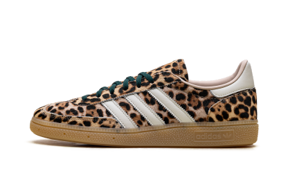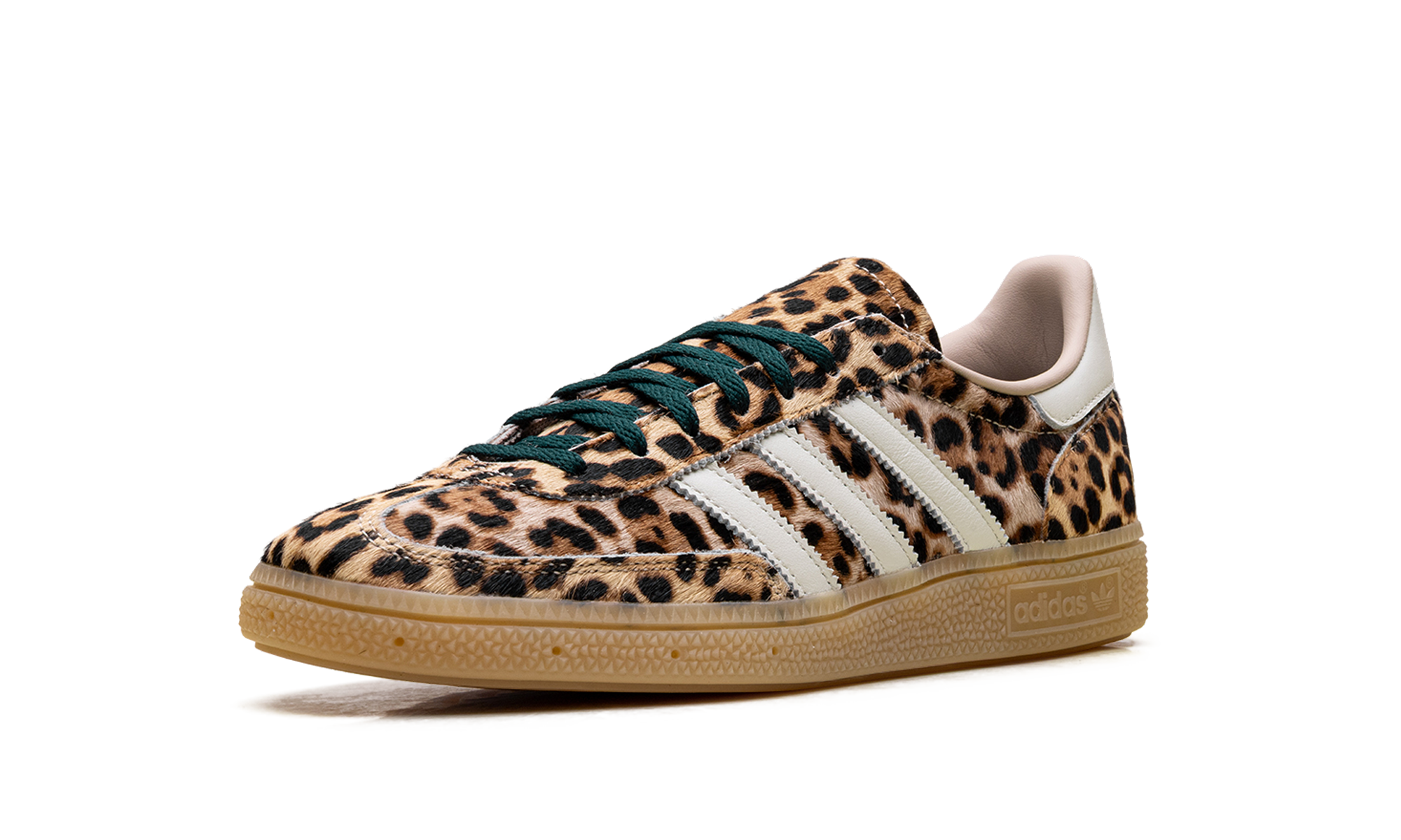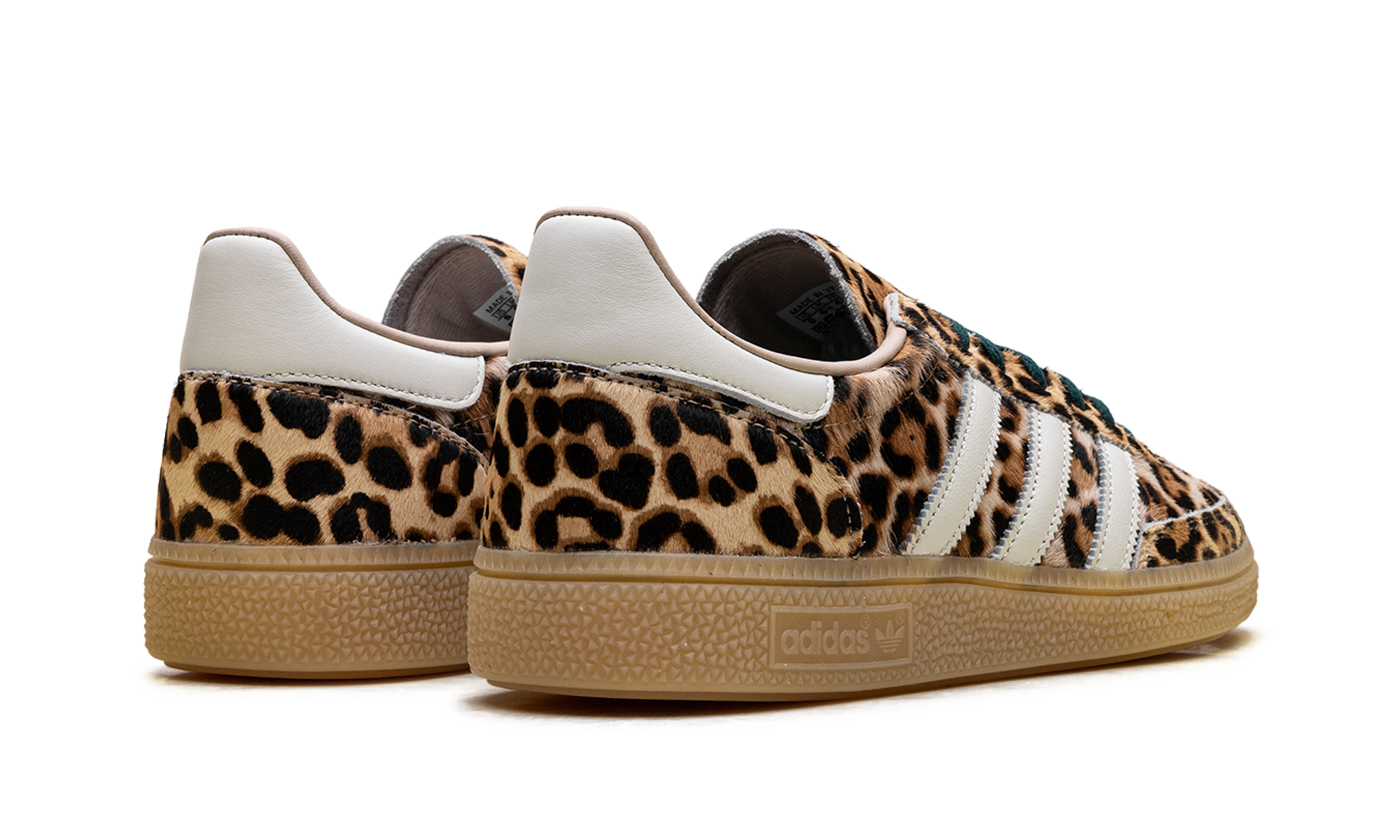 The Handball Spezial "Leopard" transforms the classic 1979 indoor silhouette into a bold lifestyle statement by replacing traditional suede with a premium faux-pony hair upper. Covered in a high-contrast leopard print, the textured base is sharply defined by "Magic Beige" white on the serrated three-stripes and heel tab, providing a clean architectural break from the busy pattern. Deep forest green laces add a sophisticated, earthy touch to the profile, while the signature translucent gum rubber cupsole remains intact to ground the maximalist design in its athletic heritage. This release balances the aggressive energy of animal print with the refined, low-profile aesthetic of a vintage terrace icon.