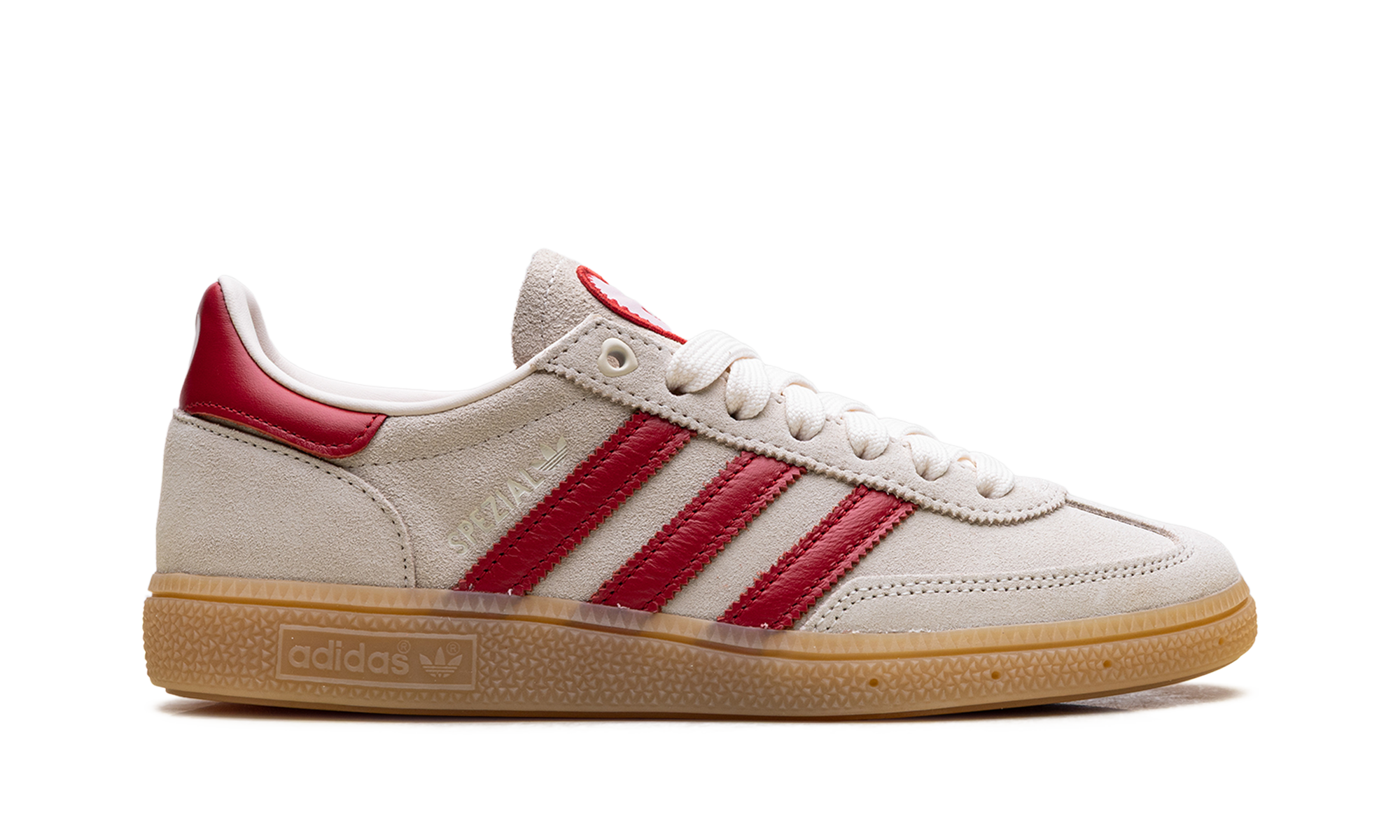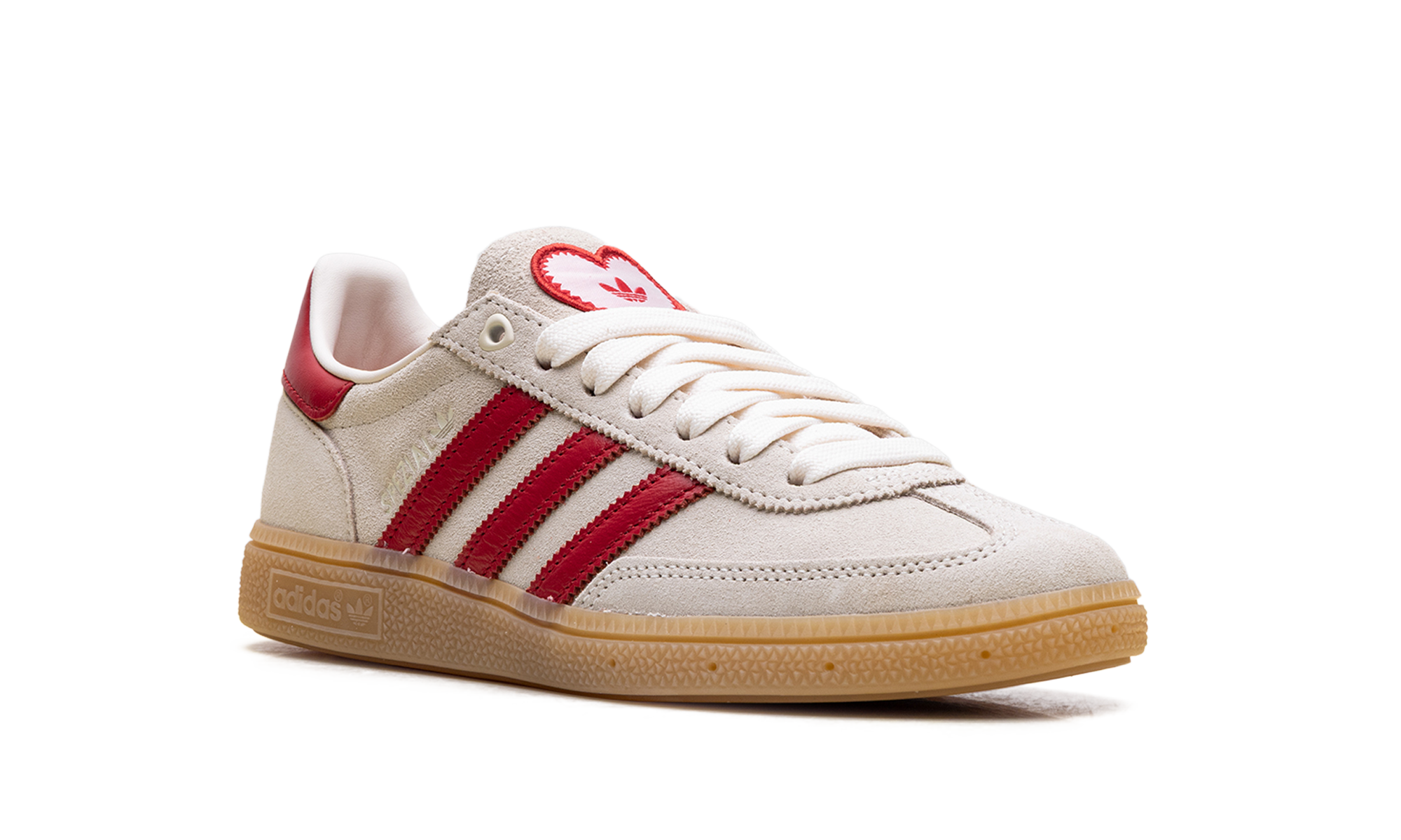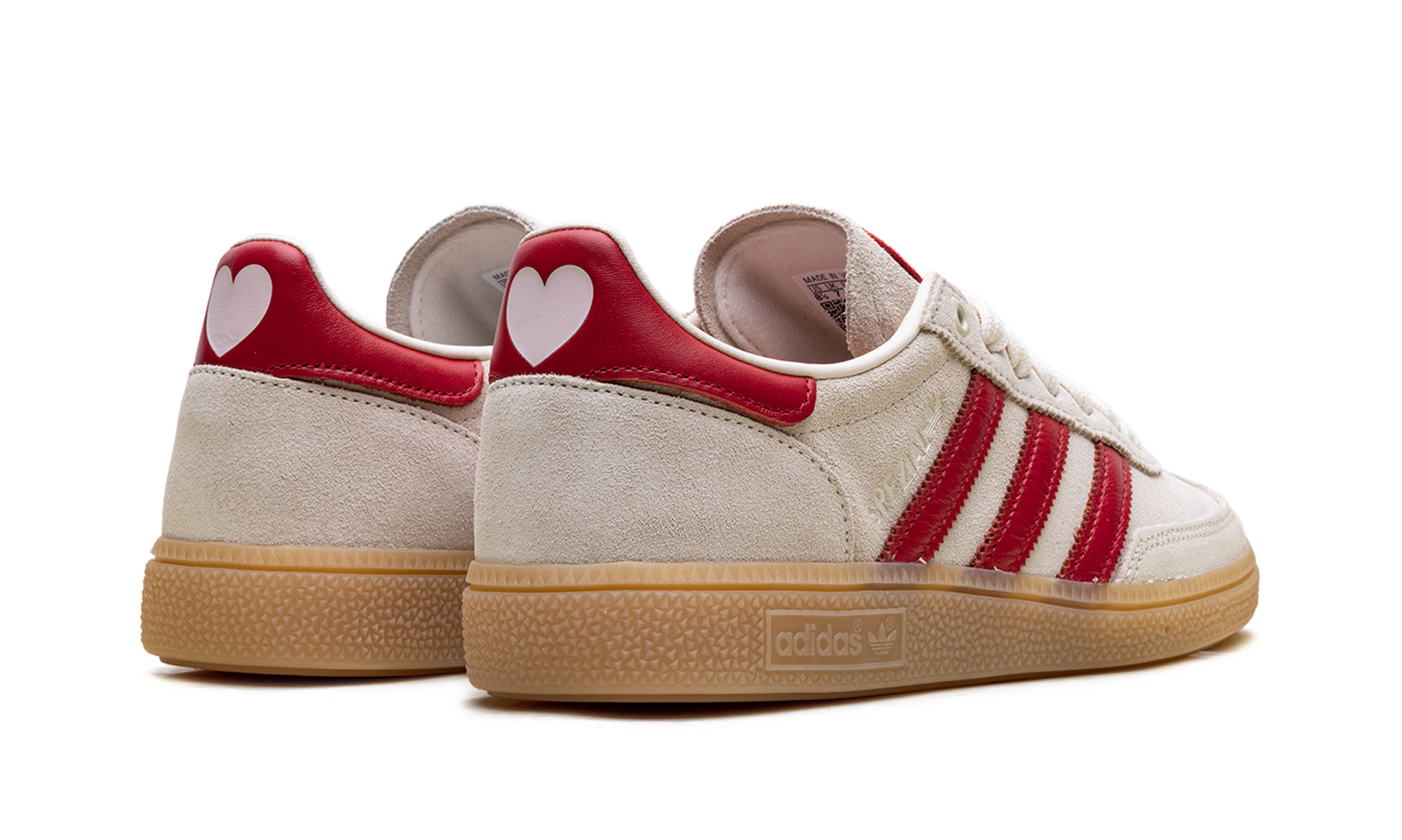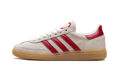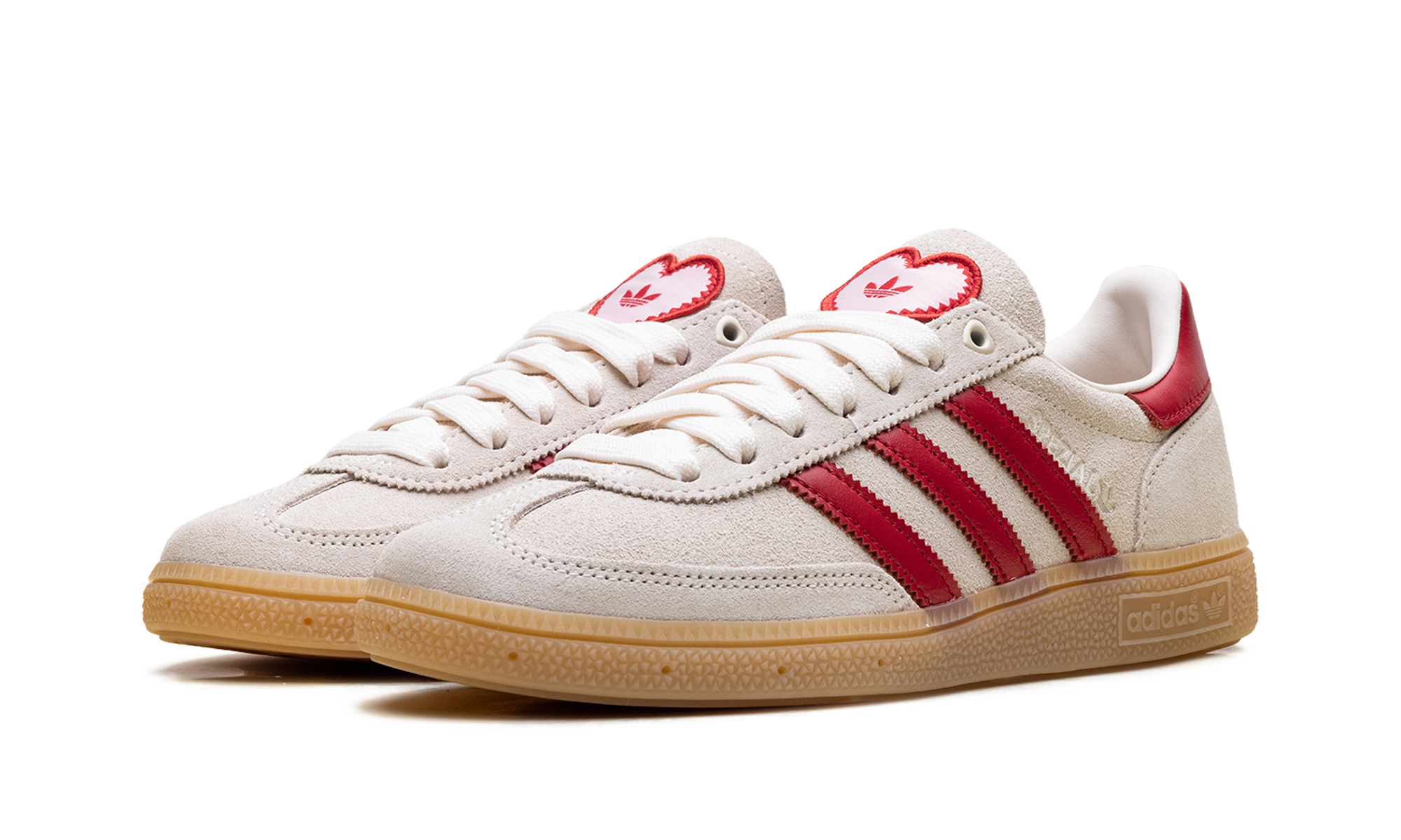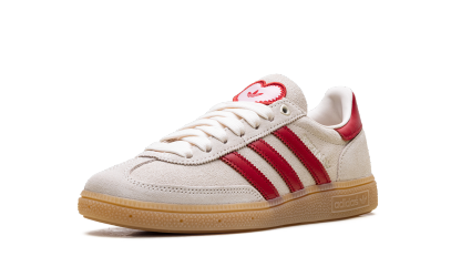The Handball Spezial "Valentine's Day" (2026) delivers a clinical, high-craft execution of the 1979 archival icon, masterfully blending its deep terrace heritage with a sophisticated, romantic technicality. This iteration features a premium pigskin suede upper in a soft "Off-White" sand, providing a plush, neutral foundation for the model’s complex landscape. The design is defined by its artisanal strike, utilizing serrated Three Stripes and a leather heel tab in a vibrant "Better Scarlet" red that provides a sharp, high-contrast profile. Grounded by the signature semi-translucent gum rubber cupsole, this release successfully pairs the Spezial’s athletic DNA with specialized romantic details, including a heart-shaped Trefoil logo on the tongue and heel, creating a versatile aesthetic for the modern capsule wardrobe.
