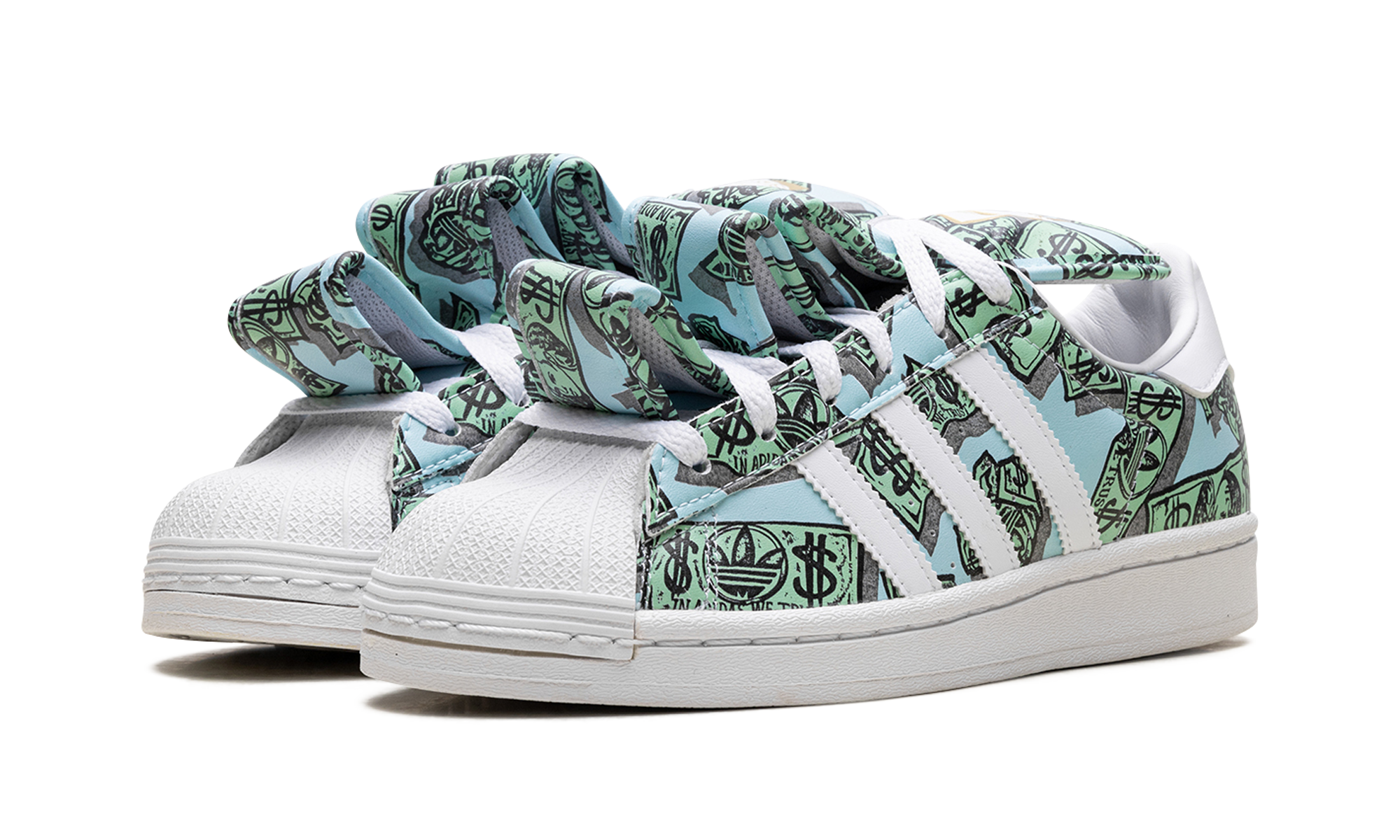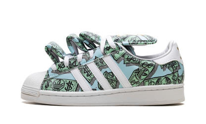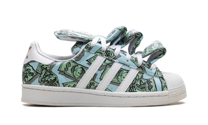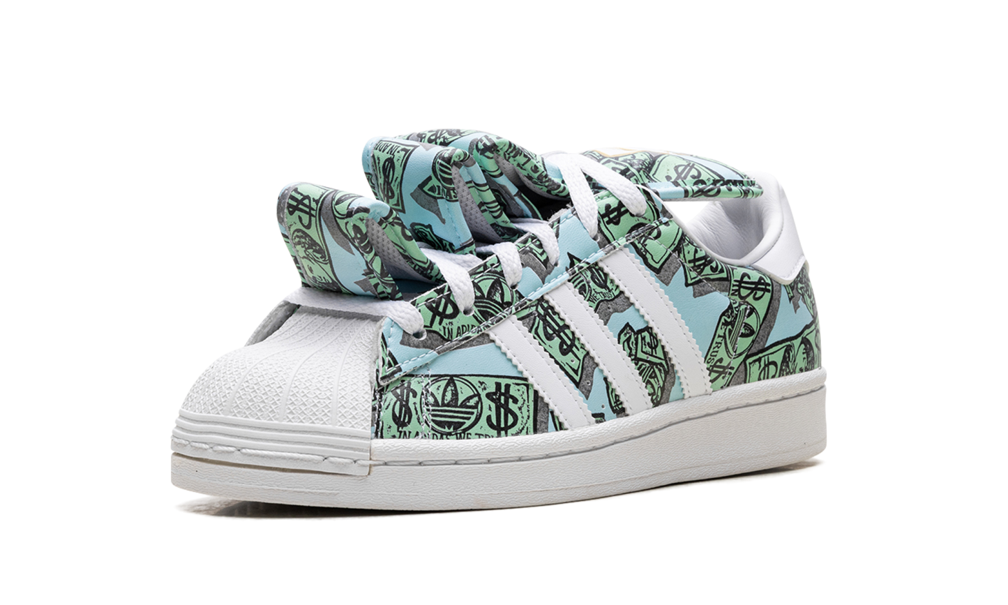 The JEREMY SCOTT - JS MONEY Superstar 'Money' shoe features a unique design with dollar bill graphics, combining classic Adidas Superstar style with Jeremy Scott's iconic bold aesthetic.