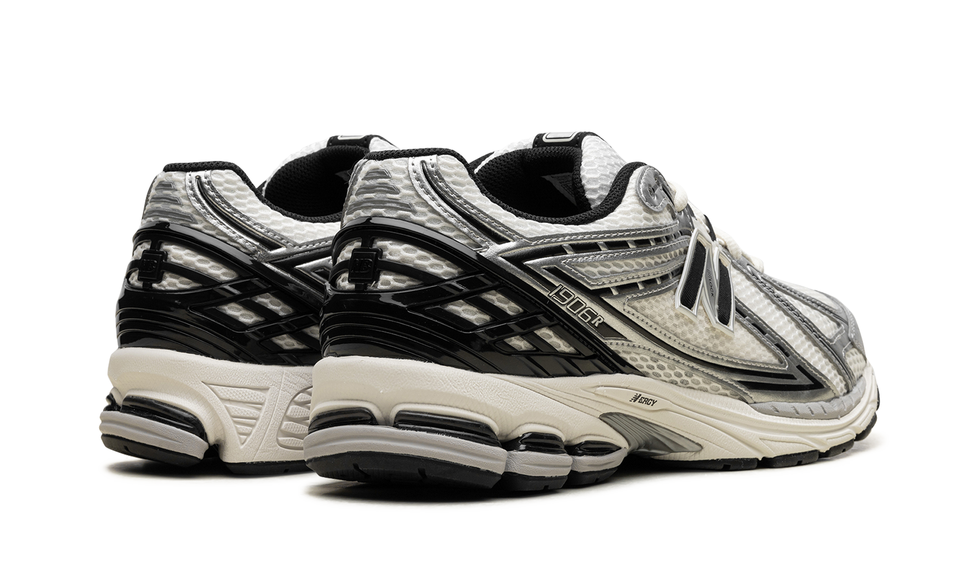 Discover the versatile New Balance 1906R "Metallic Silver/Black," a retro sneaker reimagined for today. Originally a performance running shoe, this style returned in the 2020s with a fresh appeal. It features a white mesh upper with striking Metallic Silver synthetic leather overlays accented in black. A black "N" logo adds a classic touch, while comfortable cushioning ensures all-day wear.