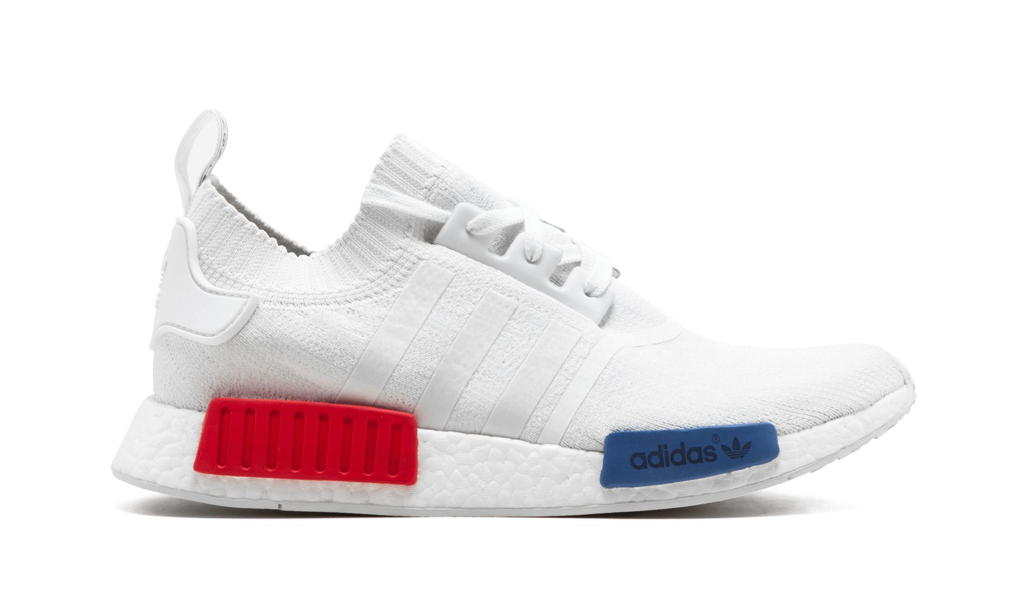 Adidas Originals reverses the “OG” colorway of the NMD in this all-white Primeknit upper with the iconic red and blue midsole inserts, for a release almost as coveted as the initial black colorway.