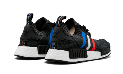 One-half of the adidas NMD R1 Primeknit "Tri-Color" pack, this clean take on 2016's most popular sneaker features a Core Black-tinted woven Primeknit upper. Three Stripes with a tri-colored treatment offers some variation, which black accents and a white Boost midsole balance out the shoe.