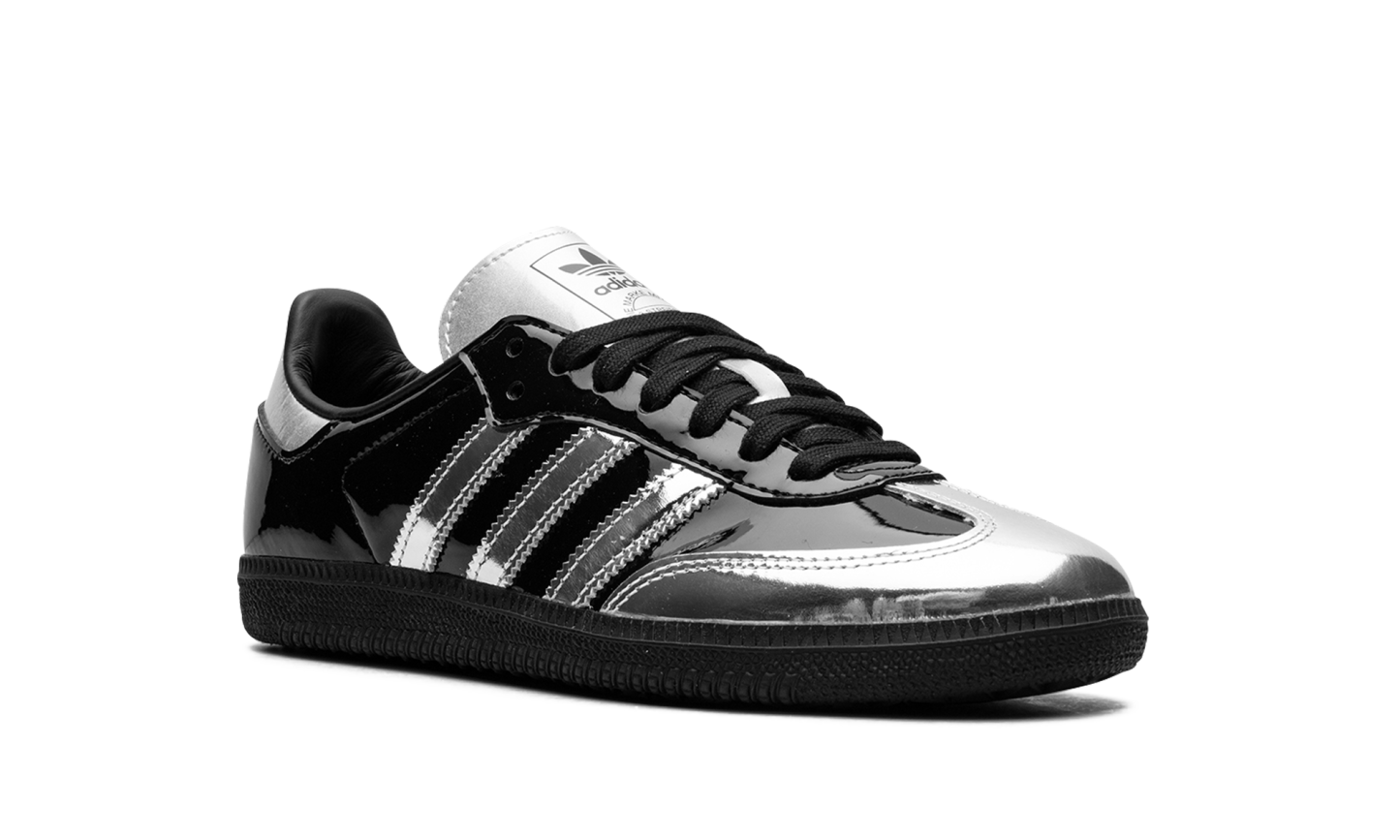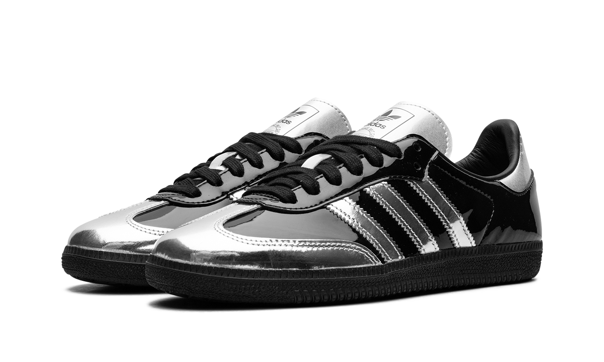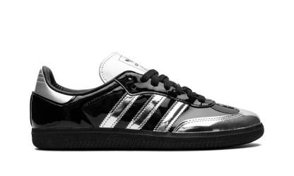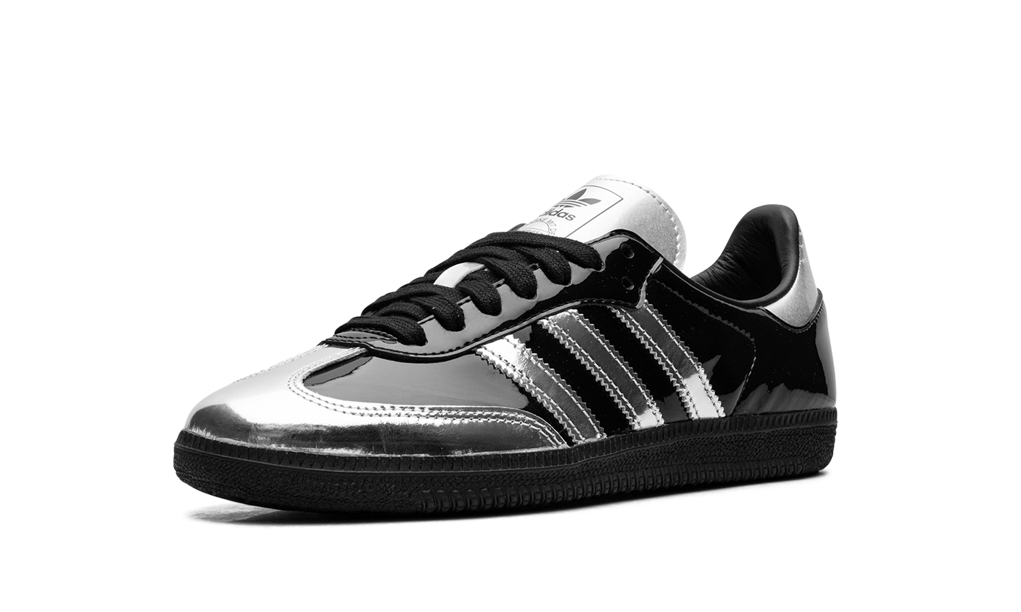 The ultimate dress-up sneaker is here! The limited-edition Adidas Samba Atmos "Tuxedo" delivers unparalleled sophistication. This collaboration with Japanese retailer Atmos features a glossy black patent leather upper, perfectly mimicking formal dress shoes. Metallic Silver Italian leather accents on the Three-Stripes, T-toe, and heel provide a striking, elegant contrast. Finished with exclusive co-branding, this is an instant classic that blends streetwear icon status with black-tie luxury.
