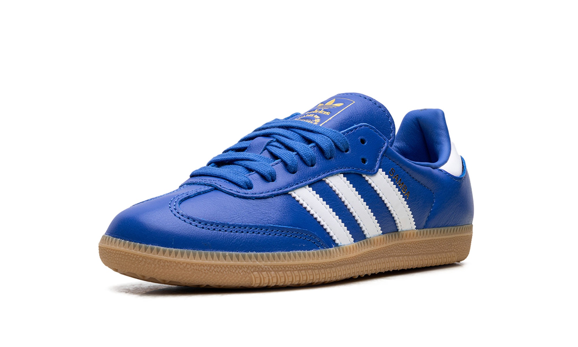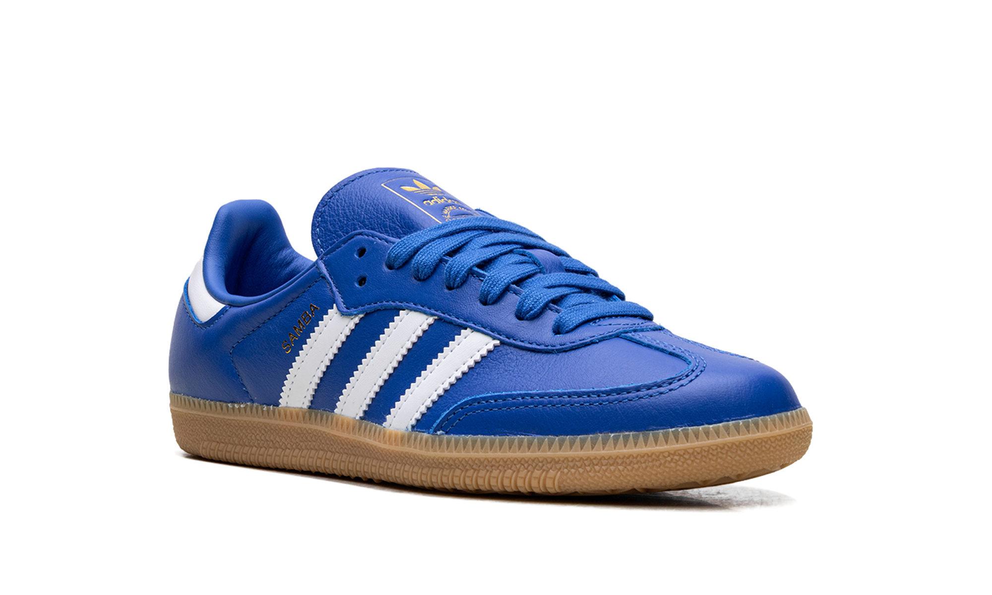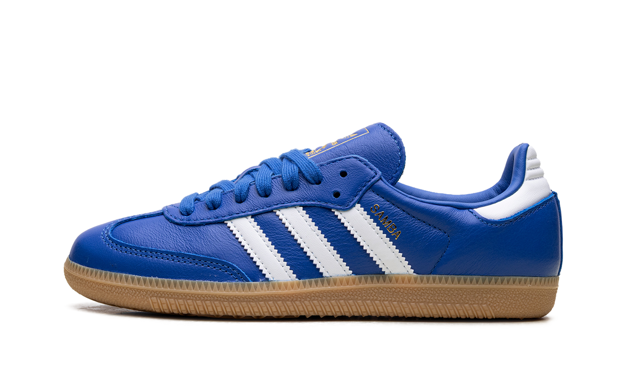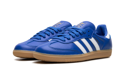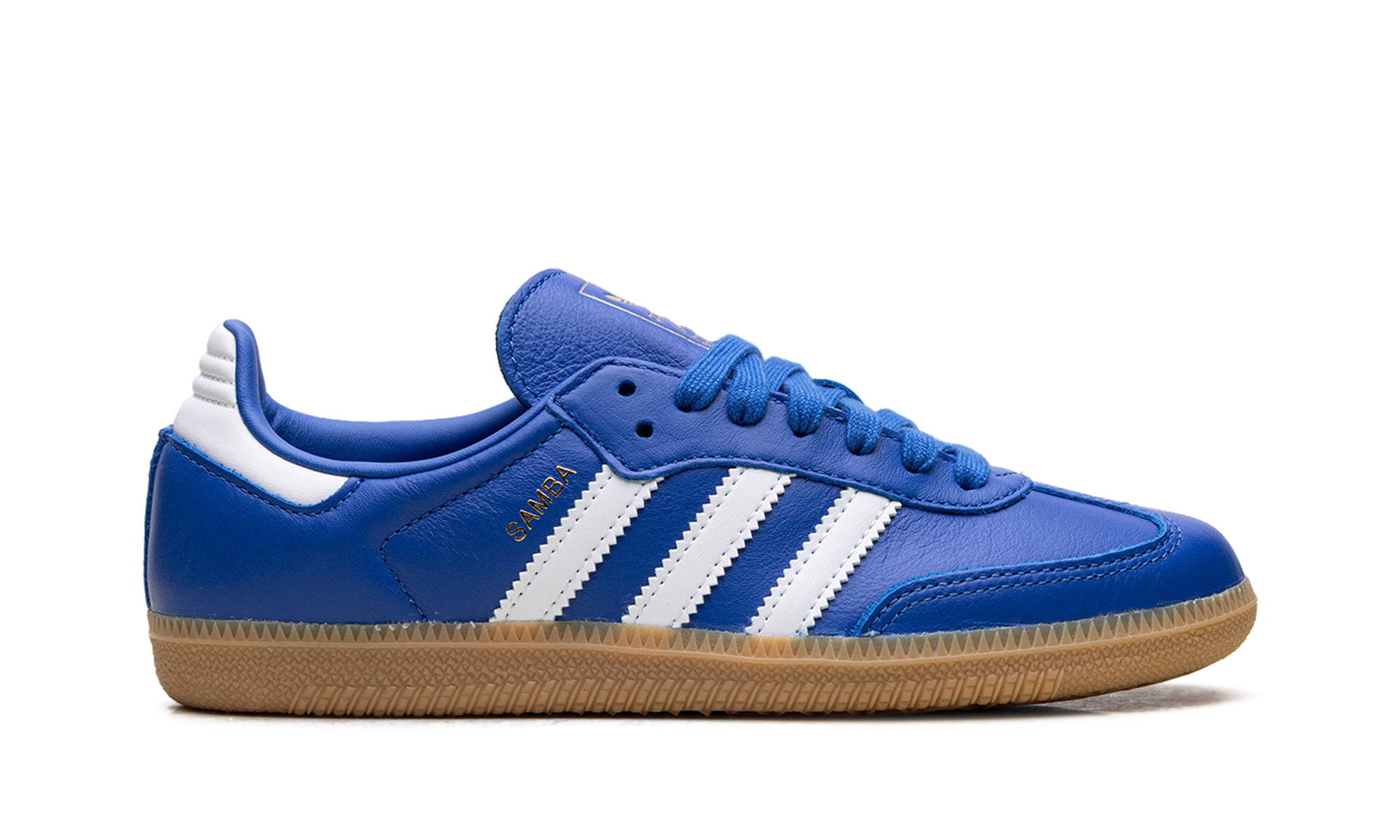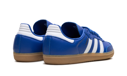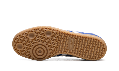 The Adidas Samba "Blue / Cloud White" offers a clean, classic iteration of the iconic indoor soccer shoe. The shoe features a rich blue upper contrasted by the signature "Cloud White" on the three-stripes branding and heel tab. It maintains the Samba's traditional design elements, including a low-profile silhouette and the distinctive gum rubber outsole for traction and vintage appeal. This colorway provides a fresh, versatile look for a timeless sneaker.