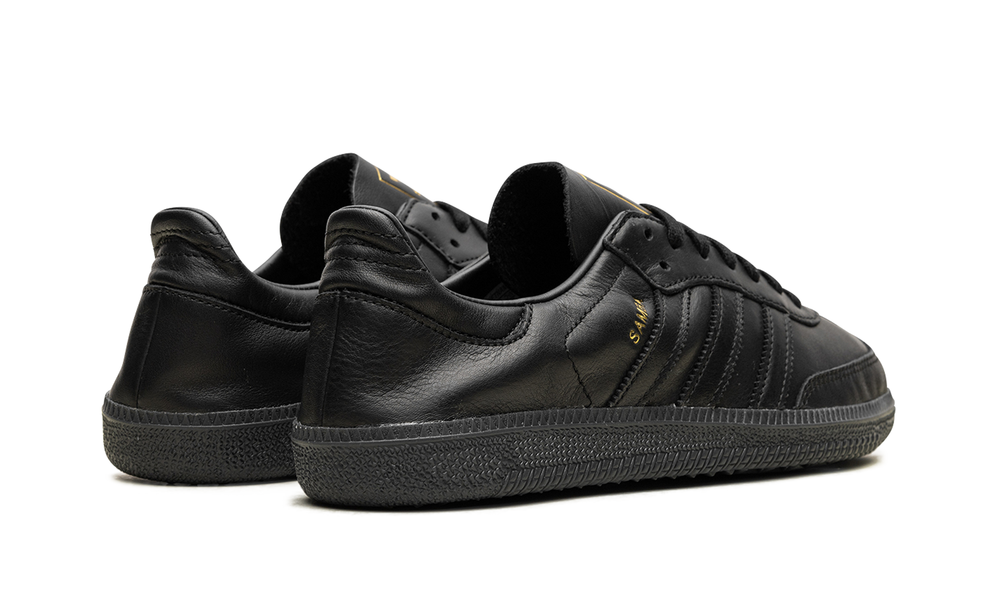 The adidas Samba Decon “Black/Gold Metallic” is a slightly modified version of the retro shoe in a black-based design. The adidas Samba Decon is a stripped-back version of the popular footwear style that has a more streamlined silhouette. On this colorway, the shoe features a black leather upper with tonal leather Three Stripes branding on the sides. A Gold Metallic “Samba” logo appears on the lateral side of the profile, matching the gold “adidas” branding on the thin leather tongue. A textured black rubber sole completes the look.
