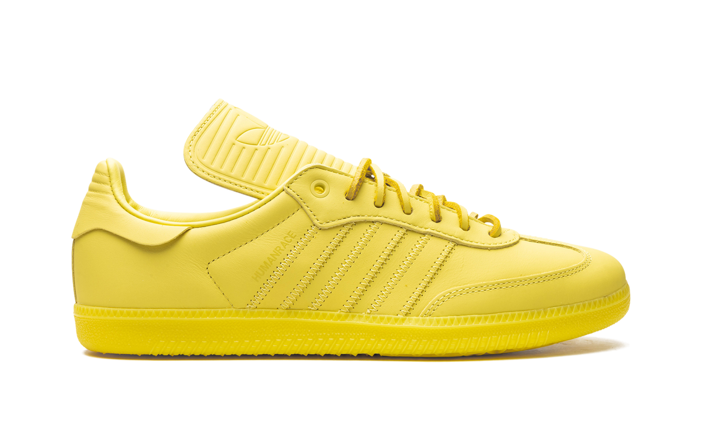 The Humanrace x adidas Samba “Yellow” is a collaboration by Pharrell’s lifestyle brand and adidas on an all-yellow colorway of the retro soccer shoe. From a greater collection of Sambas designed in monochromatic colorways, the “Yellow” has a bright yellow leather construction. Yellow leather Three Stripes branding and a “Humanrace” logo are found on the sides. An elongated tongue gives the Samba by Humanrace a vintage soccer shoe aesthetic. Brown leather laces contrast the yellow upper. A yellow rubber sole rounds out the look. Release date: May 6, 2023