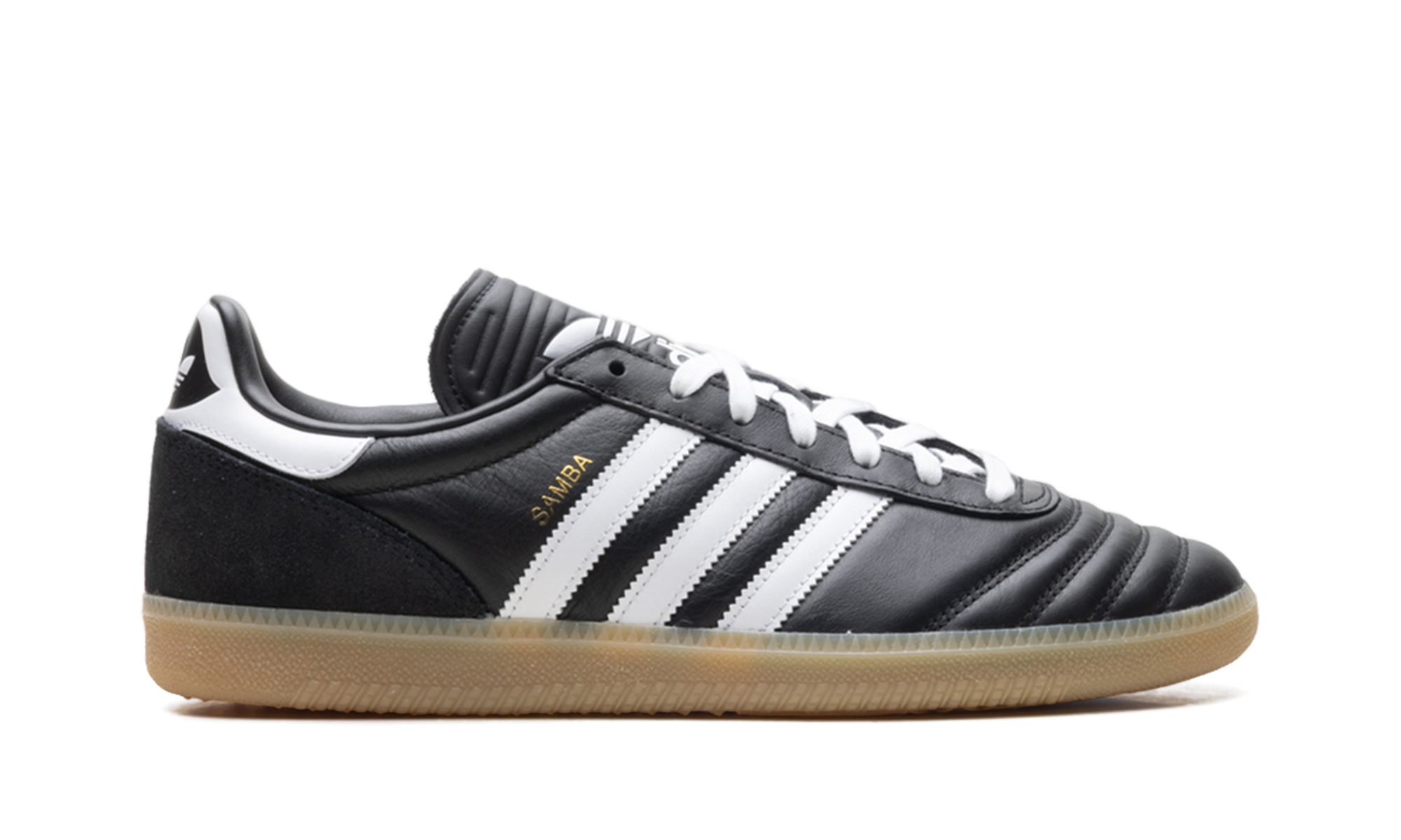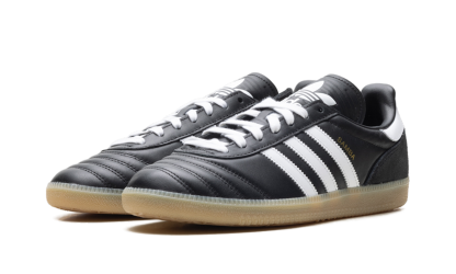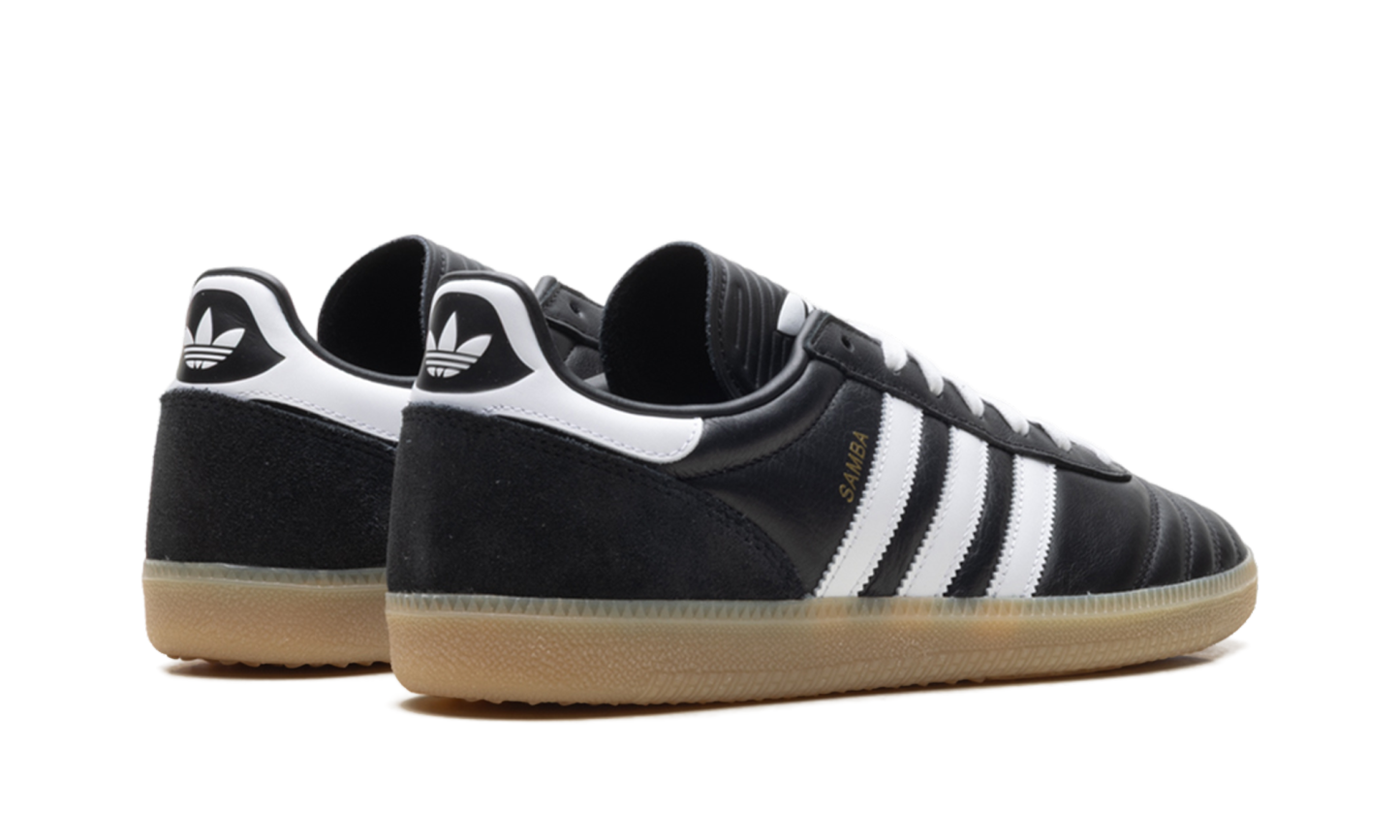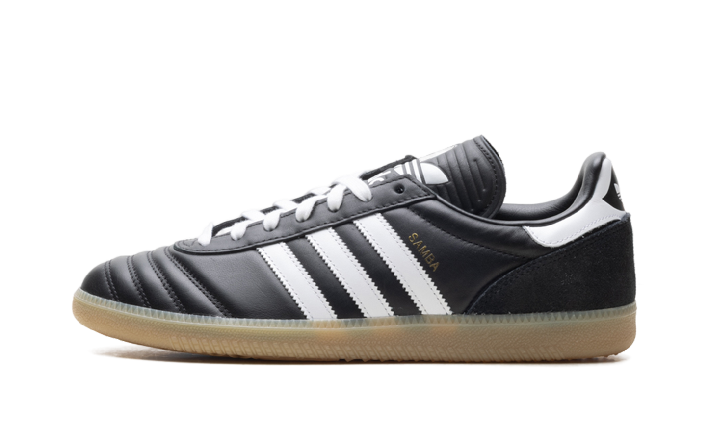 Experience the legend with the Adidas Samba JP "Black Gum" sneaker. This fresh take on the iconic indoor soccer silhouette elevates street style with premium materials and archival details. It features a sleek black leather upper, heritage-inspired quilted toe overlays, and a classic extended tongue for a retro feel. The signature gum rubber outsole grounds the look, offering durable traction and a timeless aesthetic. Lace up a piece of history and confidently kick up your everyday fashion.