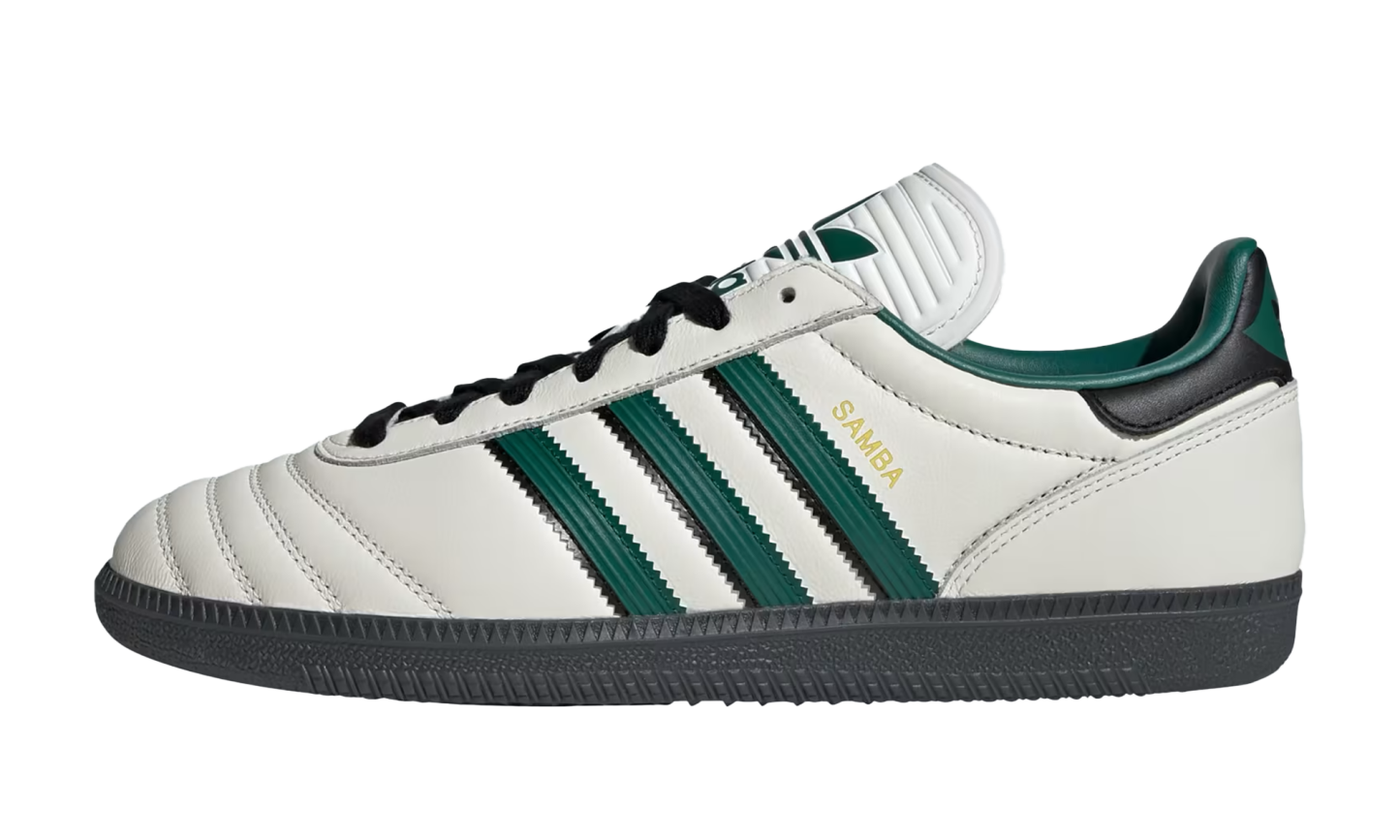 Get an updated take on a timeless classic with the Adidas Samba JP, the "Long Tongue Heritage," in a bold "Collegiate Green" colorway. This silhouette is inspired by a vintage Japanese iteration, distinguishing itself with a smooth full-leather upper and an extended tongue for a retro football feel. The striking Collegiate Green and white color scheme is finished with the iconic gum rubber outsole, offering superior grip and lasting style. It’s a clean, refined evolution of a 70-year legend.