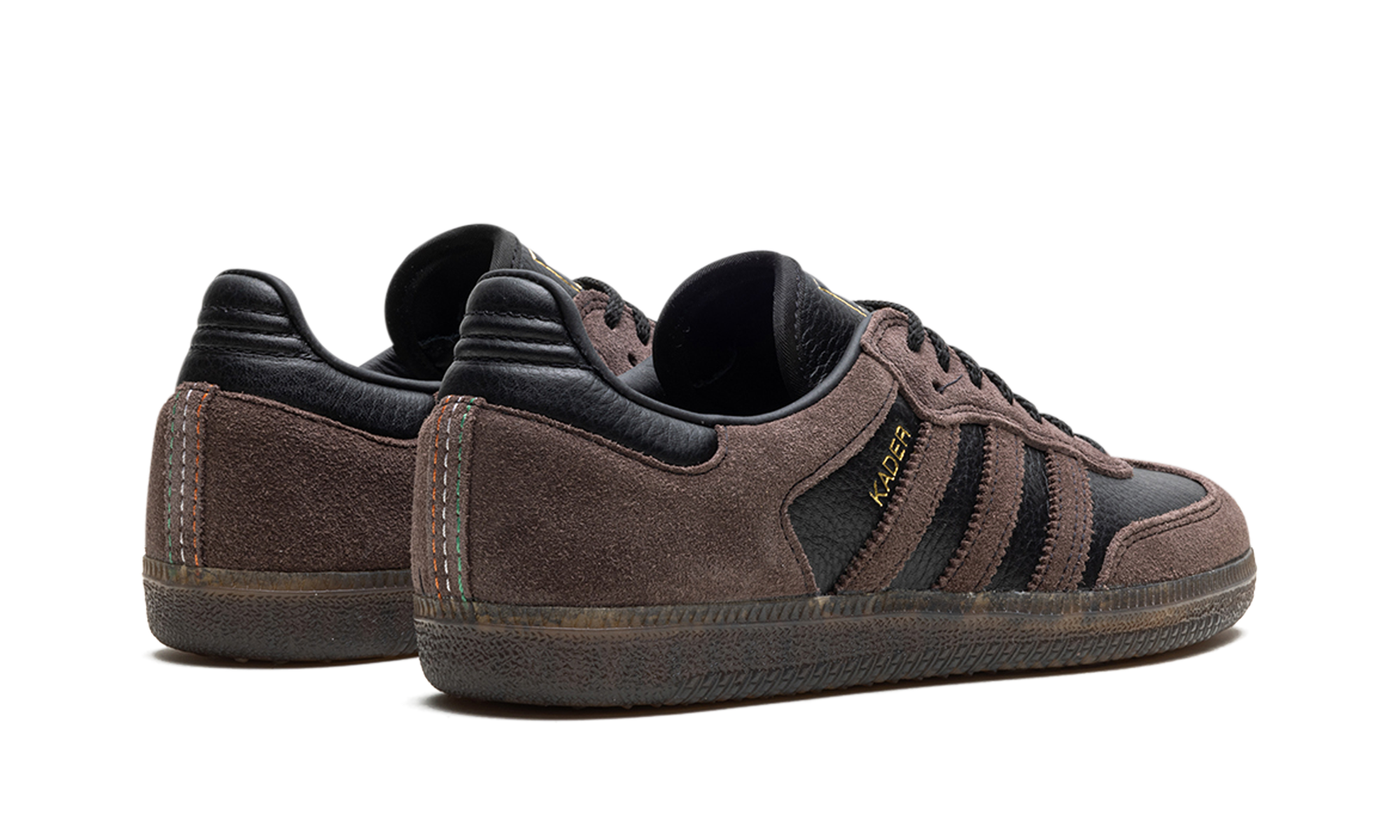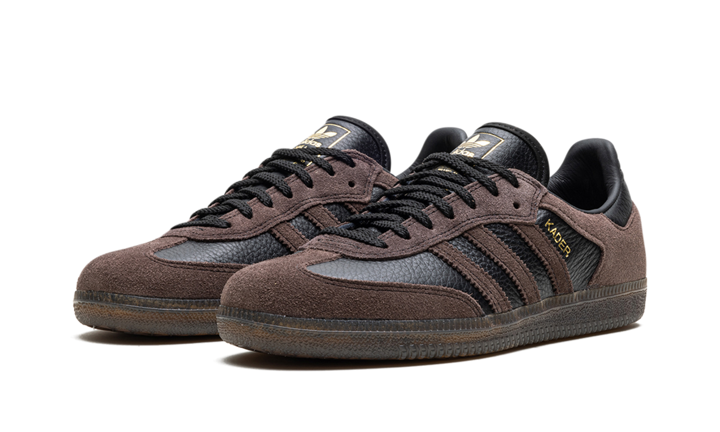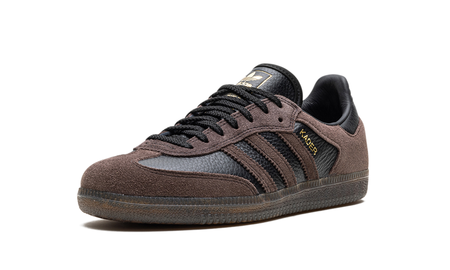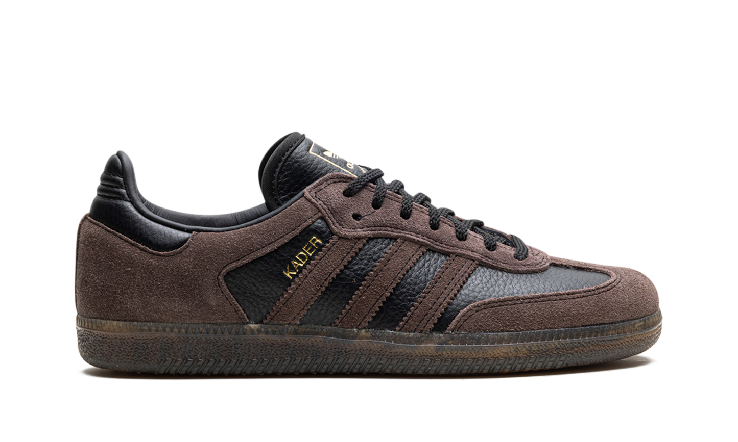 The adidas Samba ADV "Kader Sylla" is a collaboration between the professional skateboarder and adidas on a skate-ready version of the retro shoe. Modified specifically for skateboarding, the Samba ADV for Kader features a black tumbled leather base with brown suede overlays on the forefoot and heel, as well as on the Three Stripes branding. A “Kader” logo appears in gold foil next to the Three Stripes on the lateral side of the shoe. Underfoot, the gum rubber sole provides traction for optimal board feel or casual daily wear. Release date: February 10, 2024