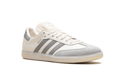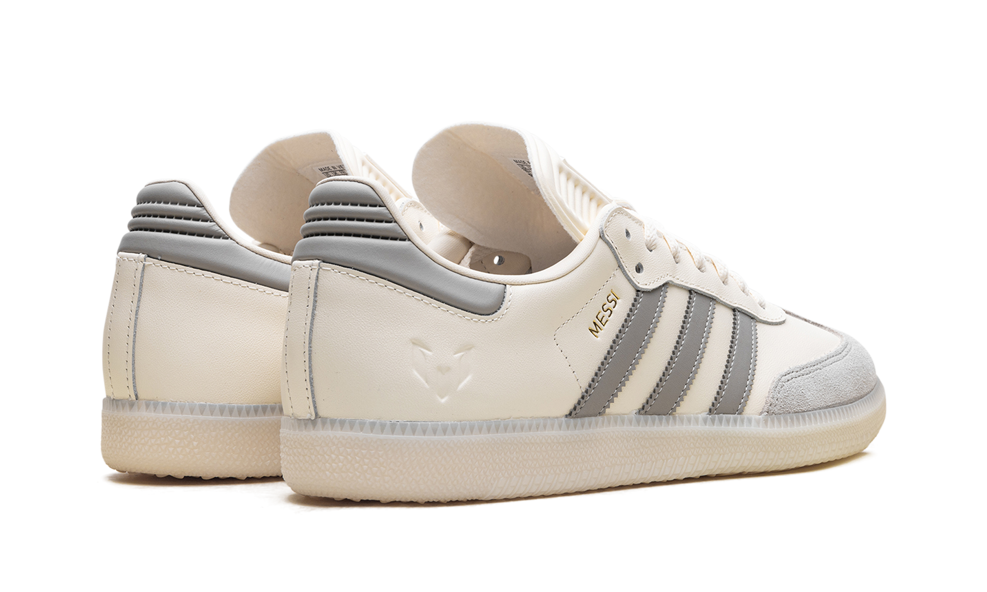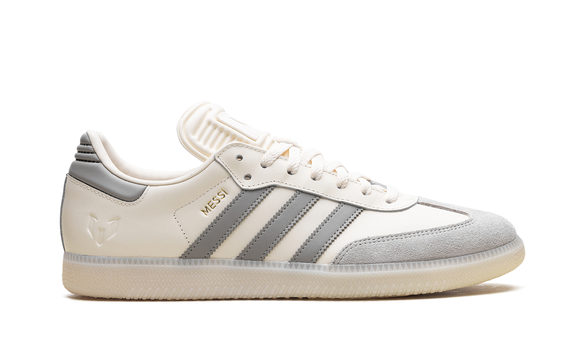 Step into soccer legend status with the Adidas Samba "Lionel Messi," the "GOAT's Classic," in a creamy "Cream White" colorway. This special-edition sneaker pays tribute to the icon with a luxurious leather upper and the signature suede T-toe. Gold foil "MESSI" lettering on the side and his personal logo on the tongue add a premium touch. Retaining the classic gum rubber outsole, this versatile shoe is a must-have piece of footwear history that celebrates the greatness of Leo Messi.