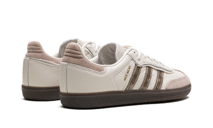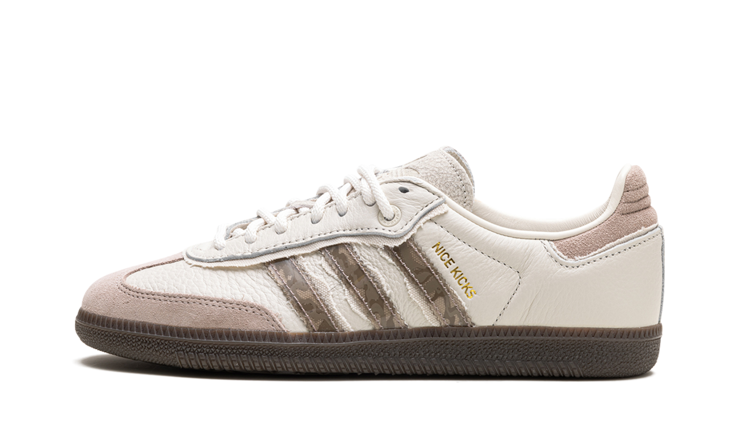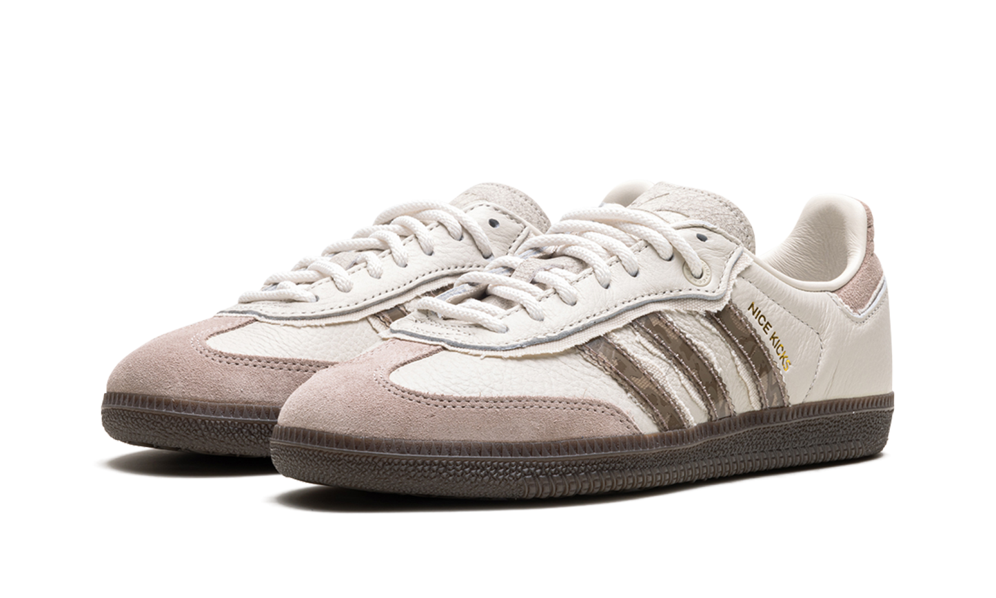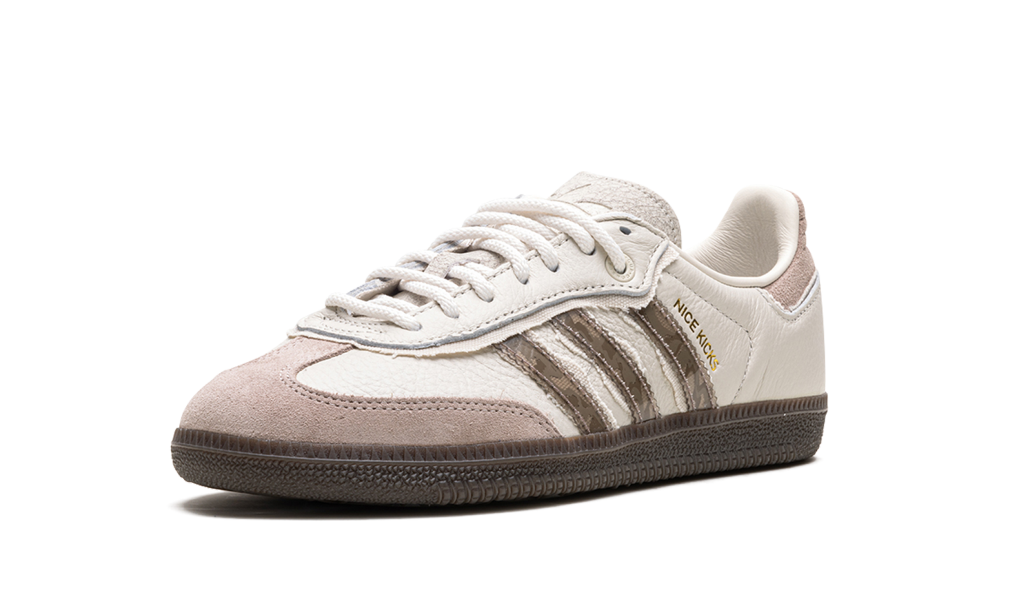 The Nice Kicks x adidas Samba "Consortium Cup" is a collaboration between the sneaker media company and adidas on a colorway of the retro sneaker made with premium materials and a keen attention to detail. Nice Kicks’ adidas Samba is one of several colorways of the Samba from the “Consortium Cup” of collaborations, which also includes colorways by Sneaker Politics, Footpatrol, and Extra Butter. As for the shoe at hand, the upper features a white tumbled leather construction with tan suede overlays on the toe and heel. The Three Stripes branding on either side of the shoe has frayed edges, and a gold “Nice Kicks” logo appears on the lateral side of the mid-panel. Dual branding can be found on the tongue and insole. An adidas Consortium hangtag completes the look. Release date: November 15, 2023
