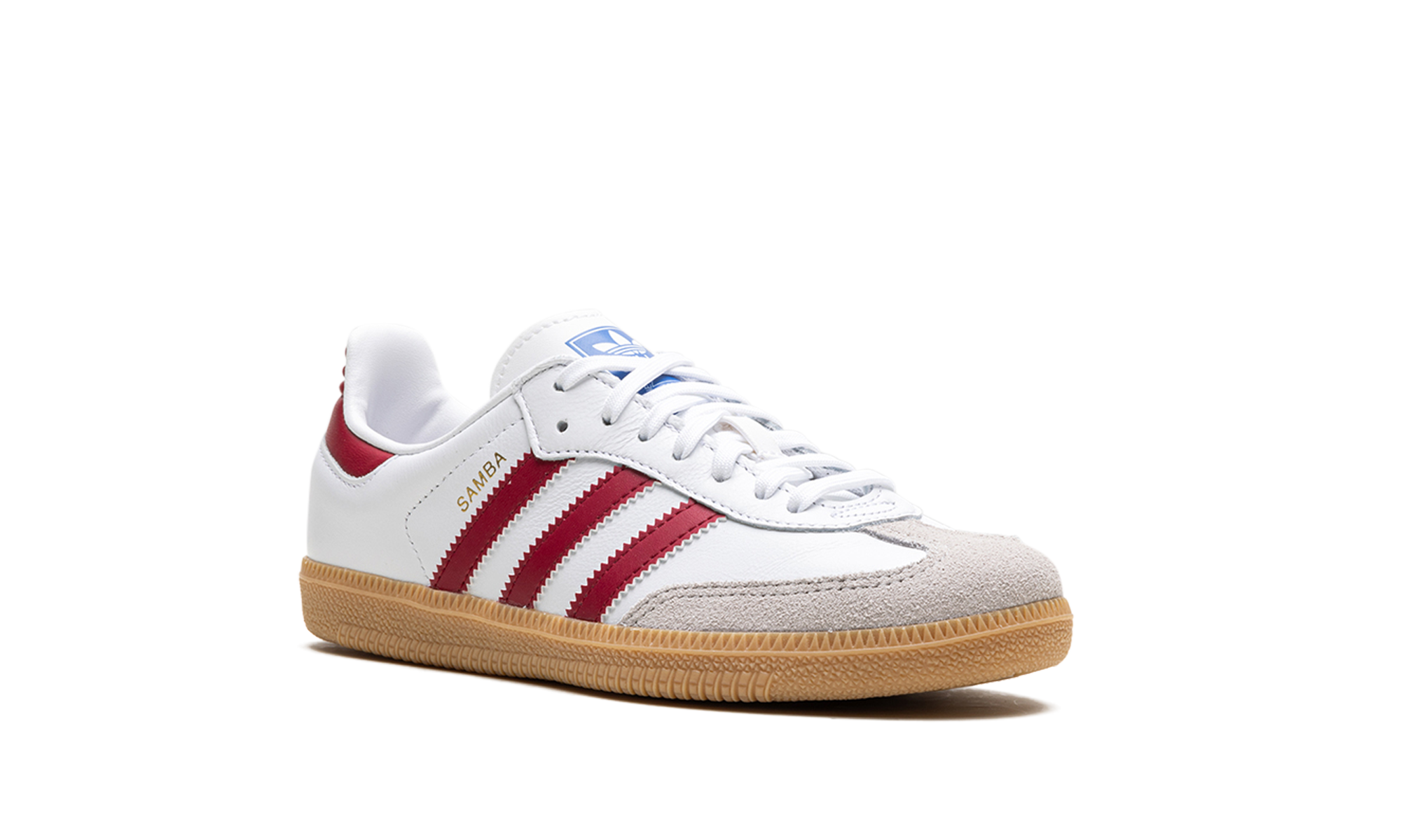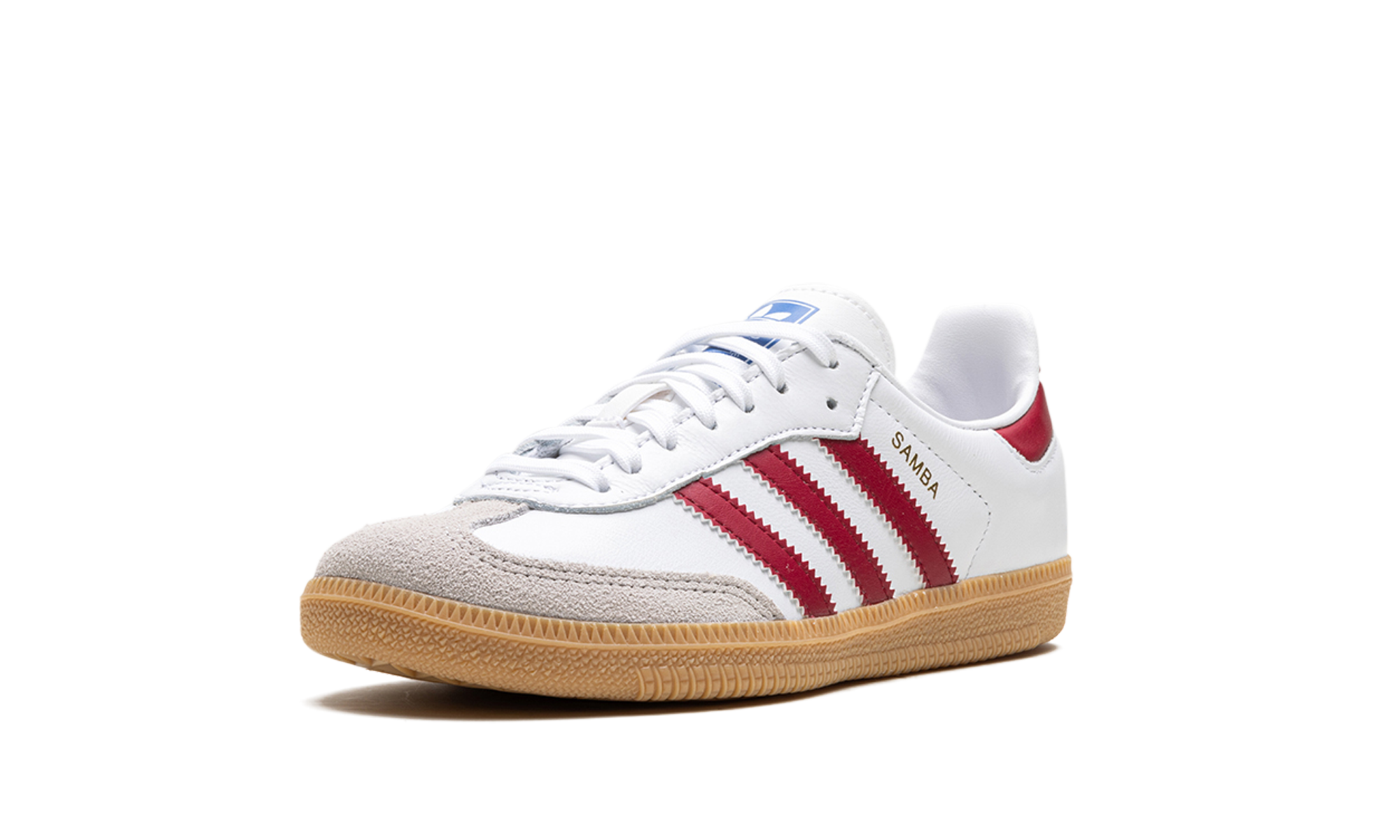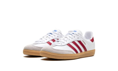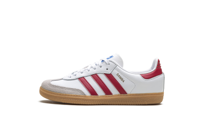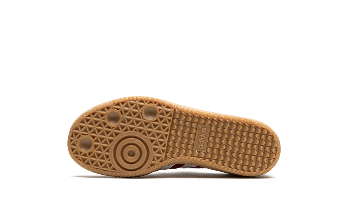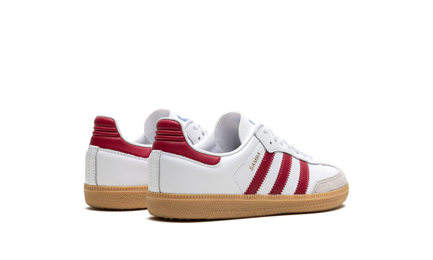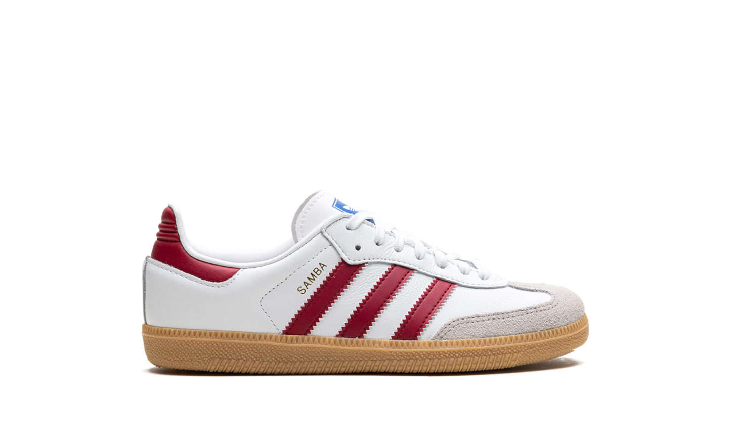 The adidas Samba OG GS “Collegiate Burgundy” is the youth sizing of the colorway of the retro shoe with burgundy accents. The shoe features a Chalk White leather upper, a grey suede overlay on the toe, and Collegiate Burgundy leather Three Stripes branding on the sides. Additional Collegiate Burgundy accenting appears on the heel tab. A gold foil “Samba” logo is printed on the lateral side of the mid-panel, and classic adidas branding can be found on the tongue. A gum rubber sole completes the look.