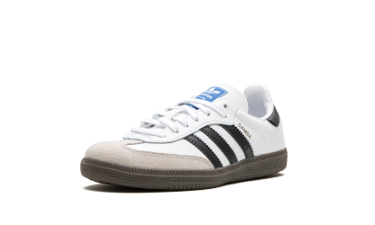 The adidas Samba OG GS “White/Black" is the youth sizing of the timeless, original colorway of the retro indoor soccer and lifestyle shoe. The Samba has enjoyed a resurgence in popularity in recent years, as the shoe’s classic design has come to be appreciated by more and more people looking for a casual shoe that can be worn with anything. The Samba’s “White/Black” colorway features a white leather construction with natural white suede overlays on the toe and forefoot. Black Three Stripes branding is found on the sides. “Samba” detailing appears in gold foil lettering on the lateral side of the shoe and an “adidas Samba” patch can be found on the tongue. A brown rubber sole completes the look.