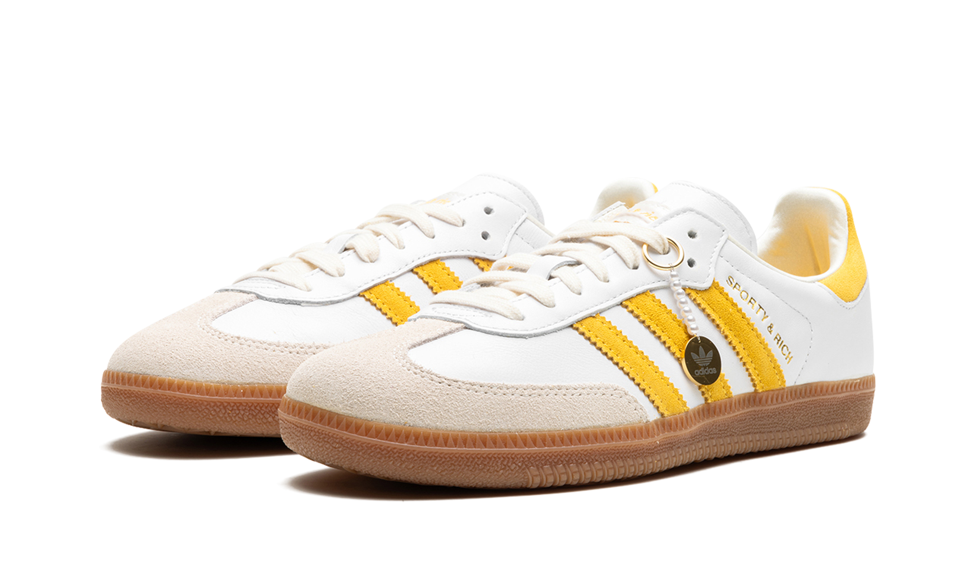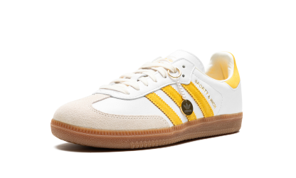 The Sporty & Rich x adidas Samba “White/Bold Gold” is a collaboration by Emily Oberg’s sportswear brand and adidas on a colorway of the classic sneaker with yellow features. One of several adidas Samba collaborations by Sporty & Rich, the “White/Bold Gold” features a white leather base with a tan suede overlay on the toe. A Bold Gold suede Three Stripes logo appears on the side, as does gold “Sporty and Rich” branding. Dual “adidas” and “Sporty and Rich” detailing is found on the gold suede heel tab. Classic adidas Samba branding appears on the tongue. A gum rubber sole completes the look. Release date: November 10, 2023