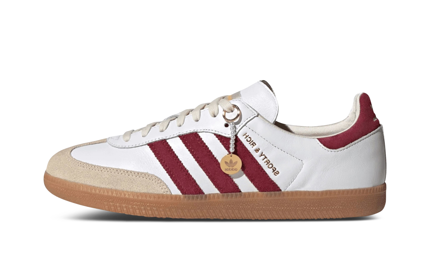 The Sporty & Rich x adidas Samba “Burgundy” is a collaboration by Emily Oberg’s sportswear brand on a colorway of the classic sneaker with burgundy details. The adidas Samba “Burgundy” by Sporty & Rich features a white leather base with a tan suede overlay on the toe. A Core Burgundy suede Three Stripes logo appears on the side, as does gold “Sporty and Rich” branding. Dual “adidas” and “Sporty and Rich” detailing is found on the Core Burgundy suede heel tab. Classic adidas Samba branding appears on the tongue. A gum rubber sole completes the look. Release date: November 10, 2023
