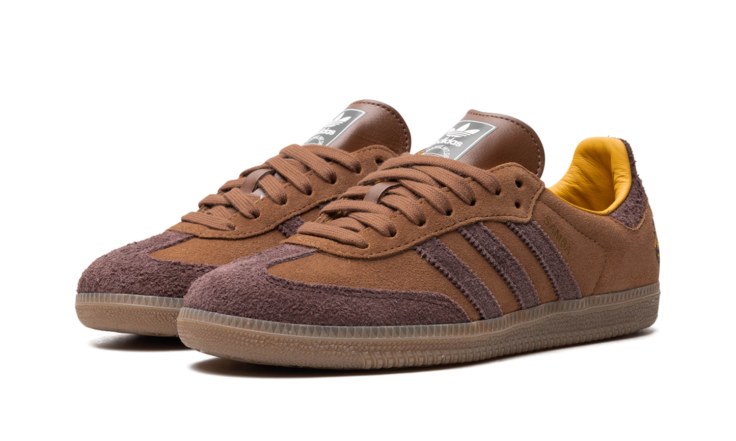 The adidas Samba OG “Talchum Pack - Preloved Brown” is a colorway of the classic shoe inspired by traditional Korean culture. The “Talchum Pack” celebrates Talchum, a Korean mask dance often performed during local festivals. A nod to the ritual appears in the form of an embroidered mask motif on the lateral side of the heel. As for the rest of the shoe, the upper features a Preloved Brown suede construction and hairy Shadow Brown suede on the overlays on the toe and heel, and on the Three Stripes branding on the sides. A Preloved Yellow leather inner lining gives the shoe a decidedly premium look and feel. Underfoot, a gum rubber sole completes the look. Release date: December 21, 2023