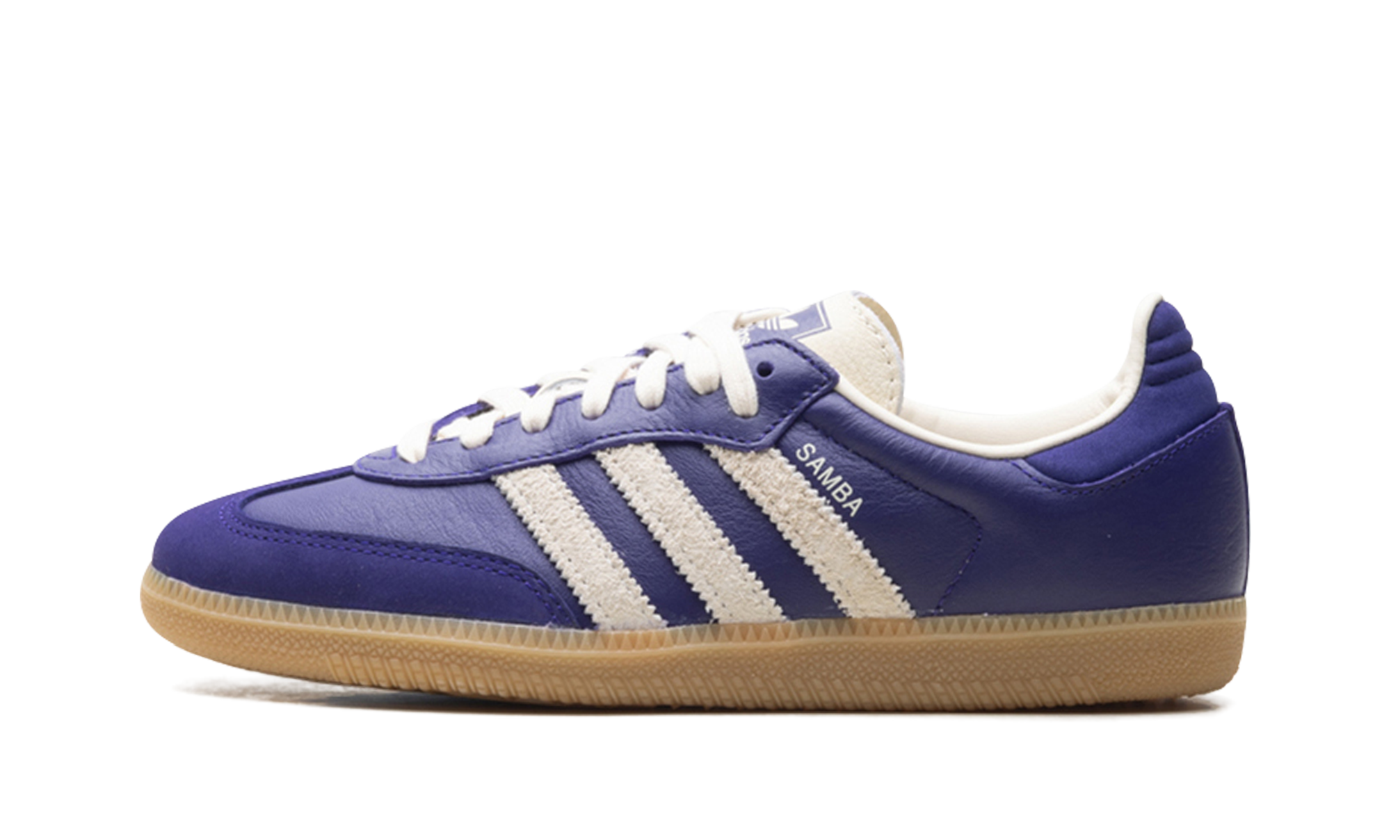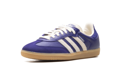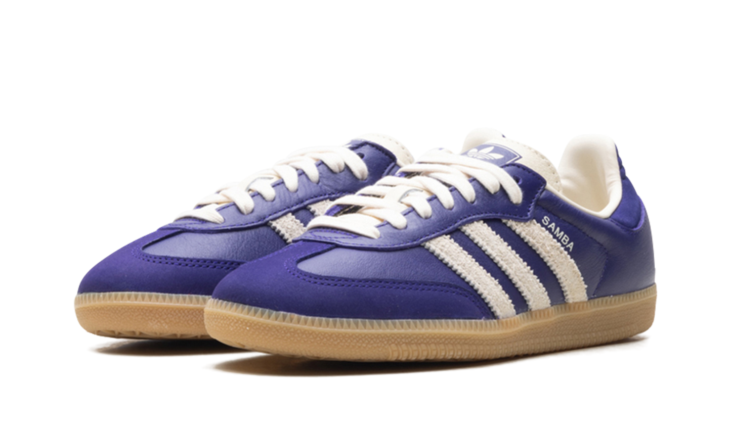 Inject a rich, vintage pop of color into your rotation with the stylish Adidas Samba OG Wmns "Collegiate Purple / Cream White". This iconic sneaker features a supple leather upper in deep purple, beautifully contrasted by creamy white serrated 3-Stripes and a signature quilt-stitched heel tab. Originally an indoor soccer shoe, its enduring appeal is rooted in the classic suede T-toe design and the durable, textured gum rubber outsole. This timeless silhouette effortlessly upgrades any casual or elevated look.