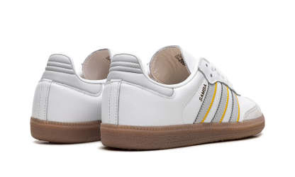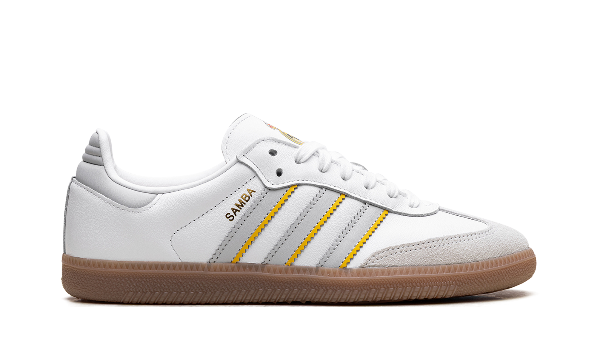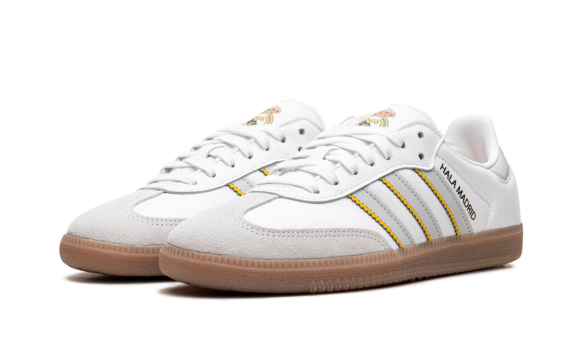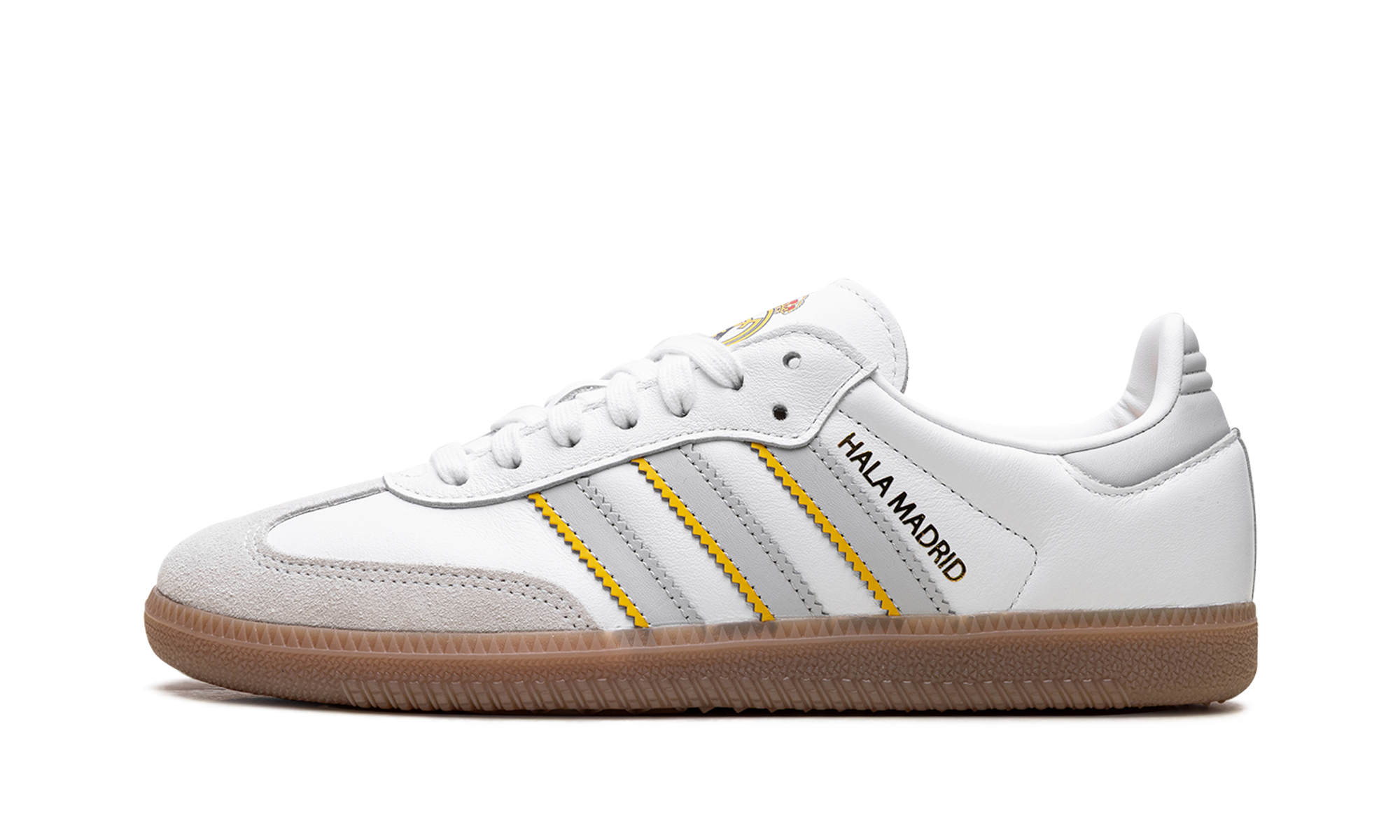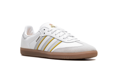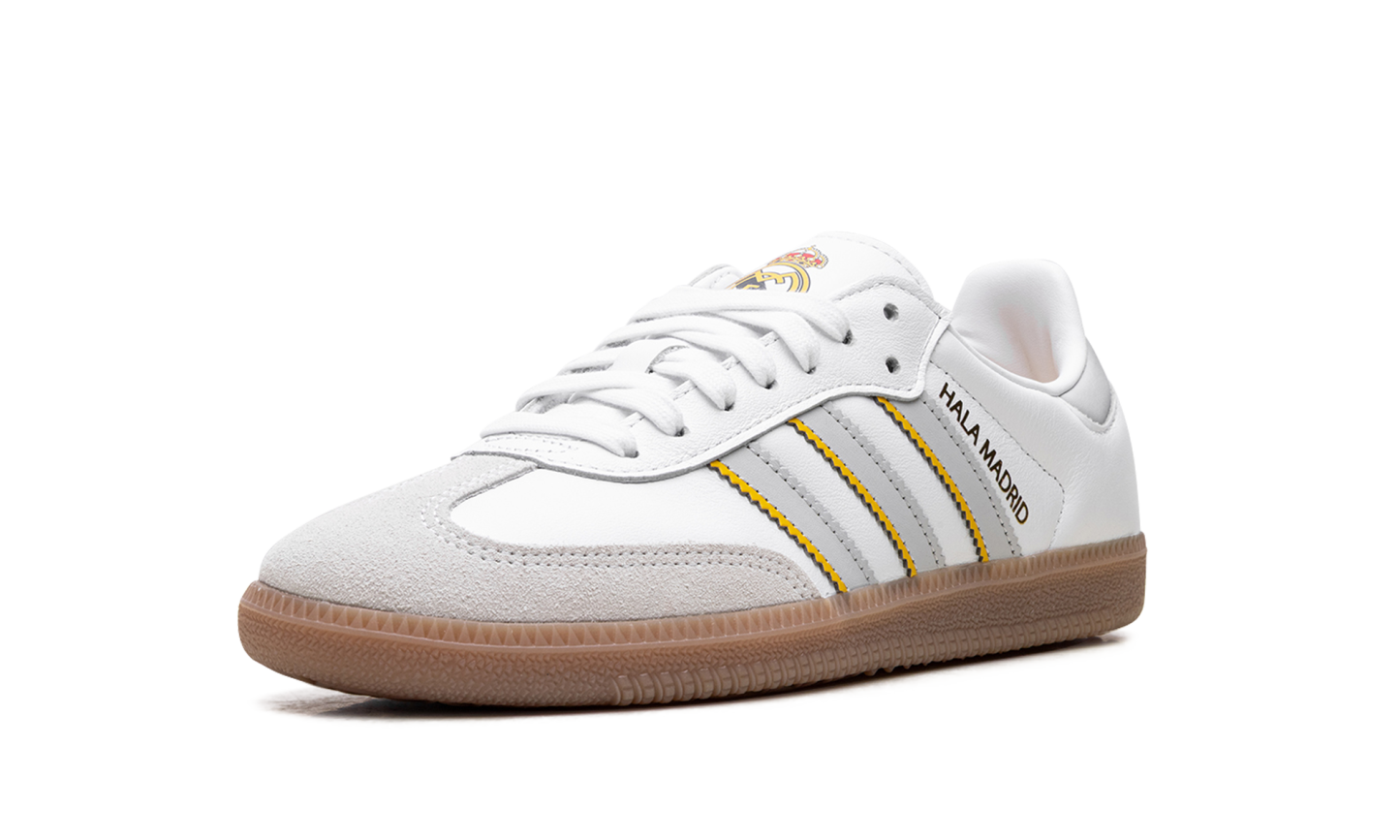 The adidas Samba "Real Madrid" pays tribute to the iconic Spanish football club. This version of the classic Samba silhouette is designed in the team's colors and features the Real Madrid crest. The sneaker maintains the traditional Samba look with a low-profile design, a premium leather upper, and the signature T-toe overlay, making it a stylish tribute to Los Blancos.