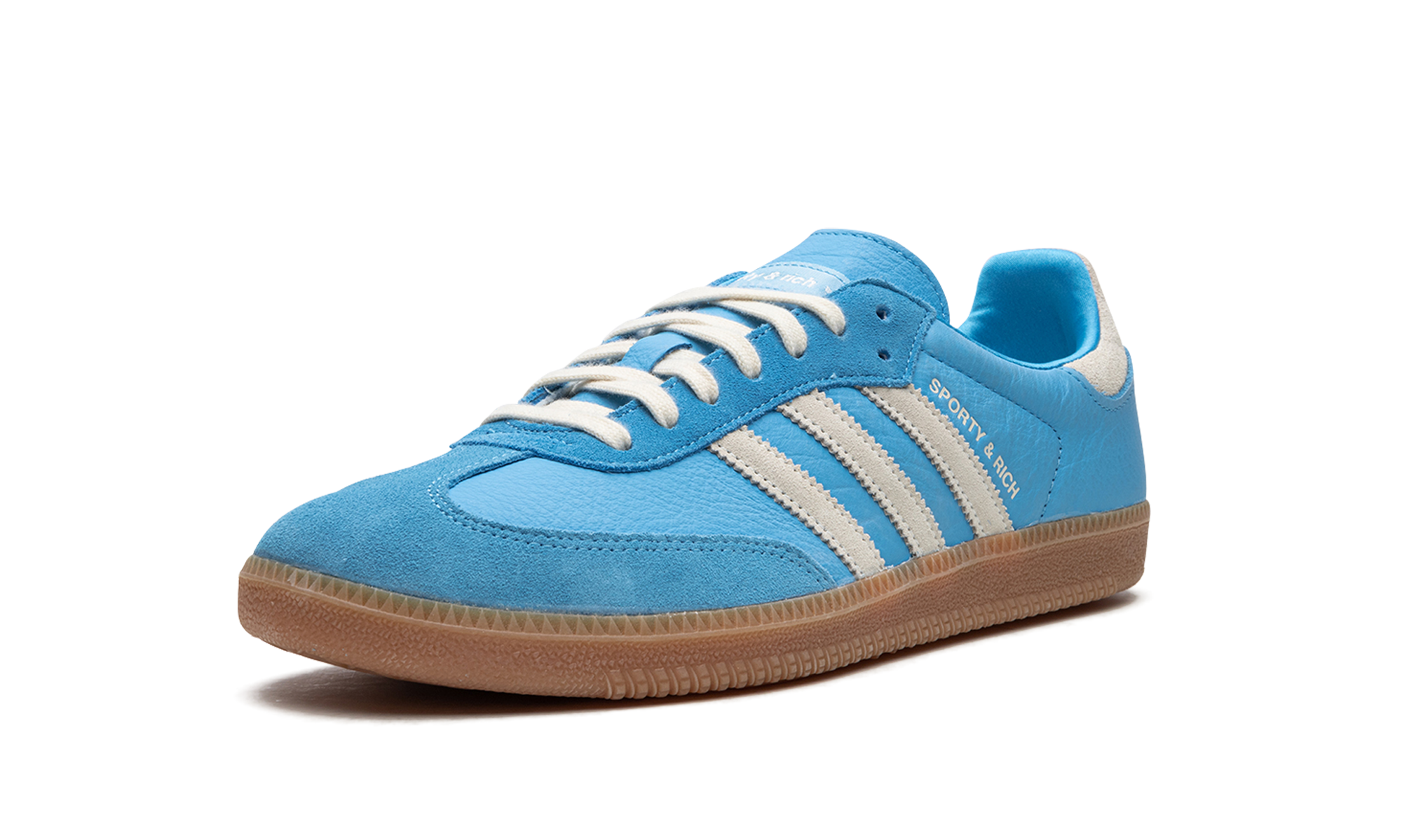 The Sporty and Rich x Women’s adidas Samba “Blue Rush” is a women’s-exclusive colorway of the popular indoor soccer shoe from the collaboration by Emily Oberg’s sportswear brand. The Sporty and Rich Samba features a can’t-miss Blue Rush leather construction with a tonal suede toe overlay. A grey suede Three Stripes logo appears on the side, as does white “Sporty and Rich” branding. Dual “adidas” and “Sporty and Rich” detailing is found on the heel tab. Classic adidas Samba branding is located on the tongue. A gum rubber sole completes the look. Release date: May 4, 2023