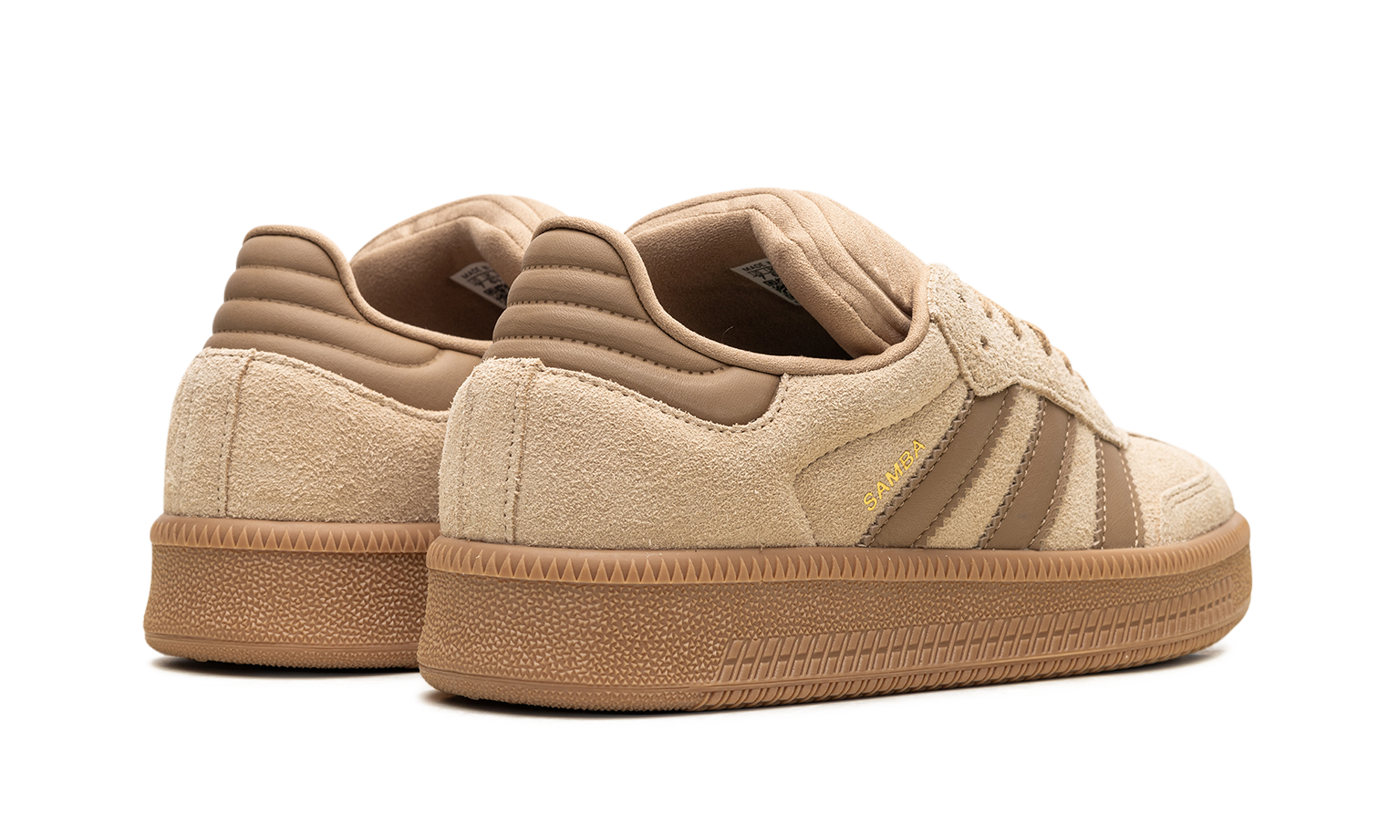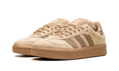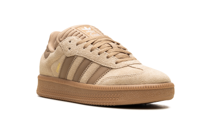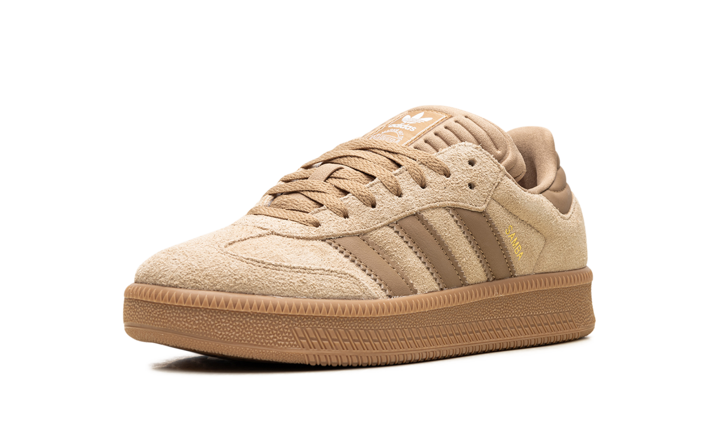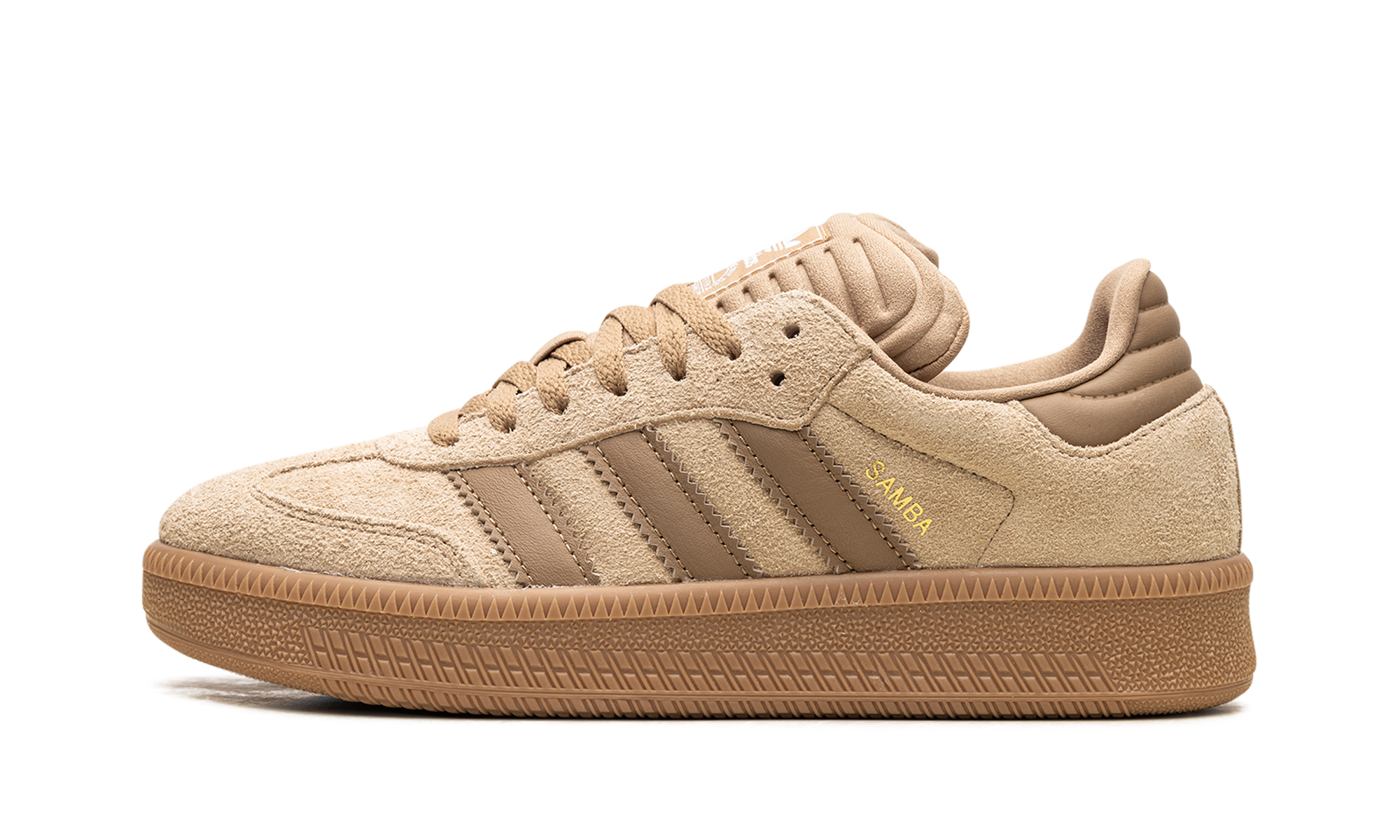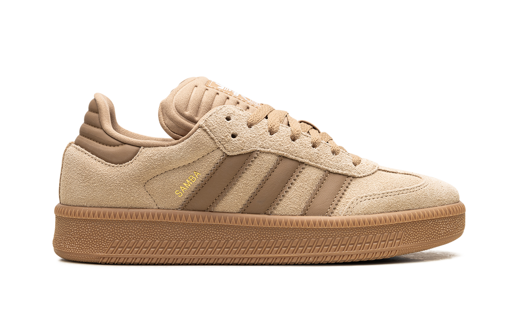 The adidas Samba XLG “Beige/Gum” is a beige-based colorway of the alternate version of the popular retro shoe. The adidas Samba XLG is a modified take on the classic silhouette with a platform-style rubber sole and a thick padded tongue. Here, the shoe has a Beige suede upper with a tonal suede overlay on the toe. A darker shade of beige is used on the Three Stripes branding that appears on the side. A gold “Samba” stamp can be found on the lateral side of the mid-panel. Classic “adidas” detailing is printed on the tongue. A chunky dark gum rubber sole completes the look.