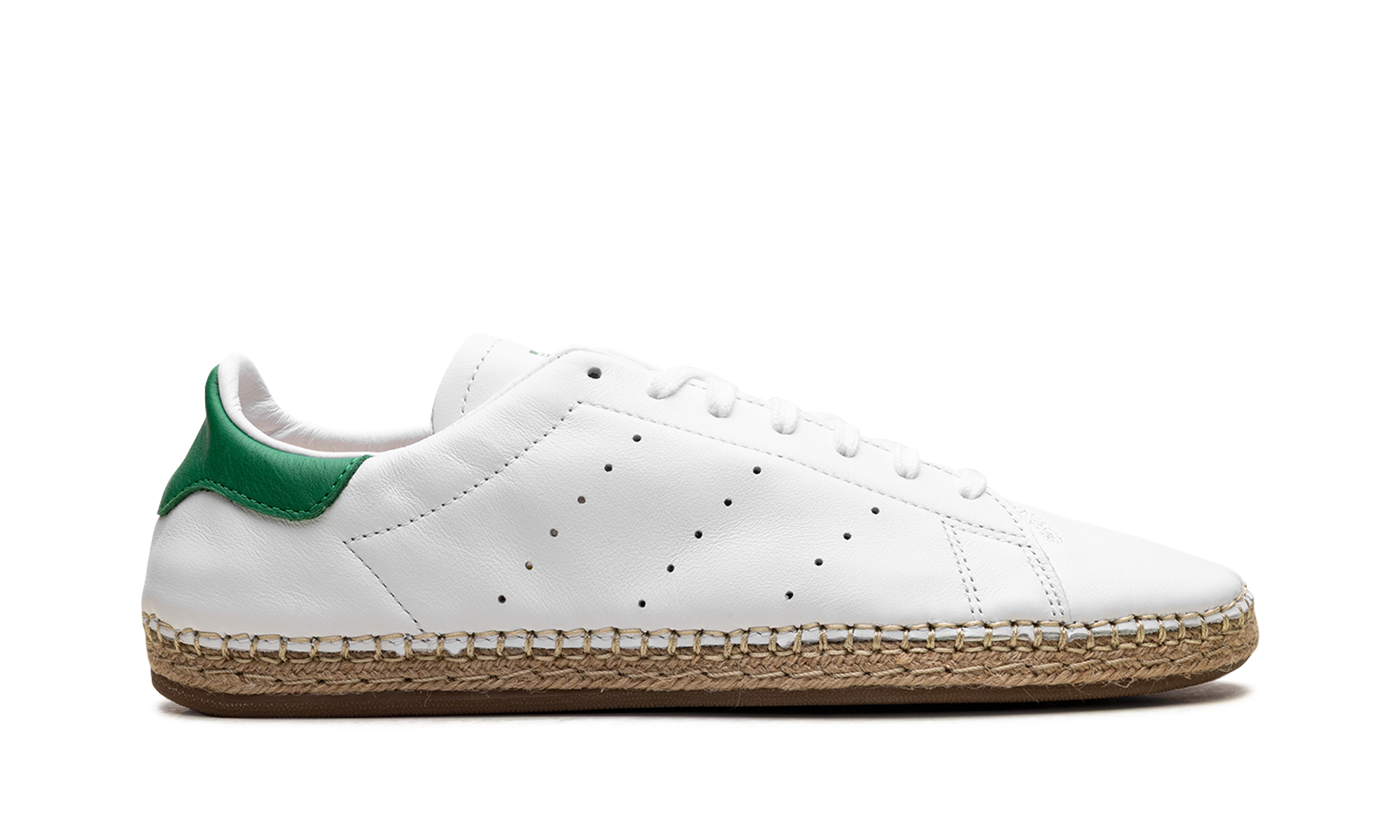 Step into summer with the fresh adidas Stan Smith Espadrille x CLOT sneaker, nicknamed "White Green." This inspired collaboration re-imagines the classic tennis silhouette by swapping the traditional sole for a laid-back woven jute espadrille, perfect for warm-weather style. The premium white leather upper retains the iconic green heel tab and perforated Three Stripes, with subtle CLOT branding on the sockliner. Its deconstructed, relaxed design and gum rubber outsole offer both sophisticated flair and easy comfort.