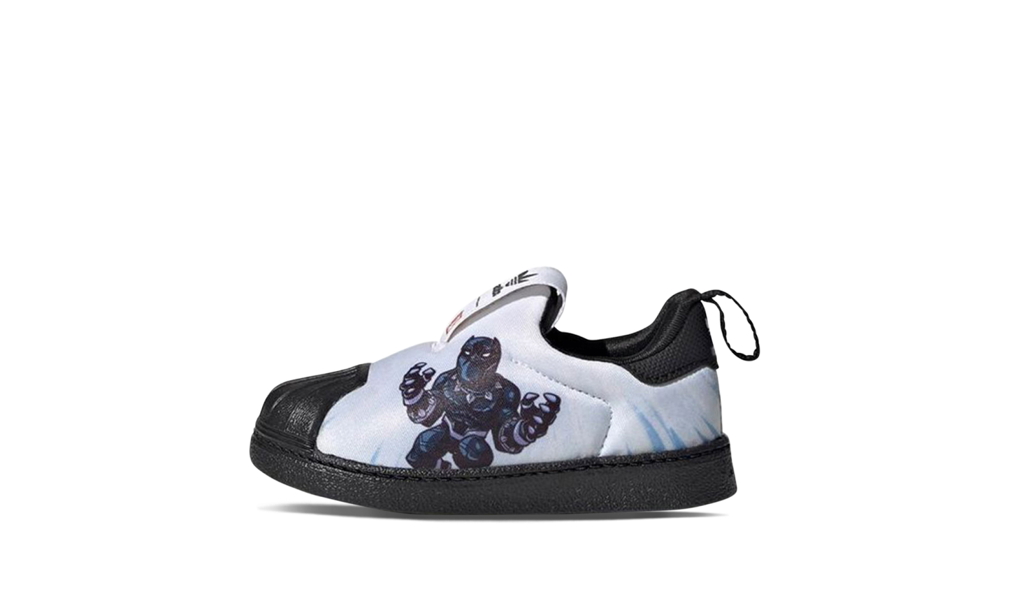 The Superstar 360 TD 'Marvel - Black Panther' shoe features a design inspired by the iconic Marvel character Black Panther, blending classic Adidas Superstar style with unique superhero details.