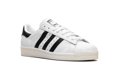 The Superstar 82 'White' shoe features a classic design with a clean white aesthetic, offering a versatile and timeless addition to any sneaker collection.