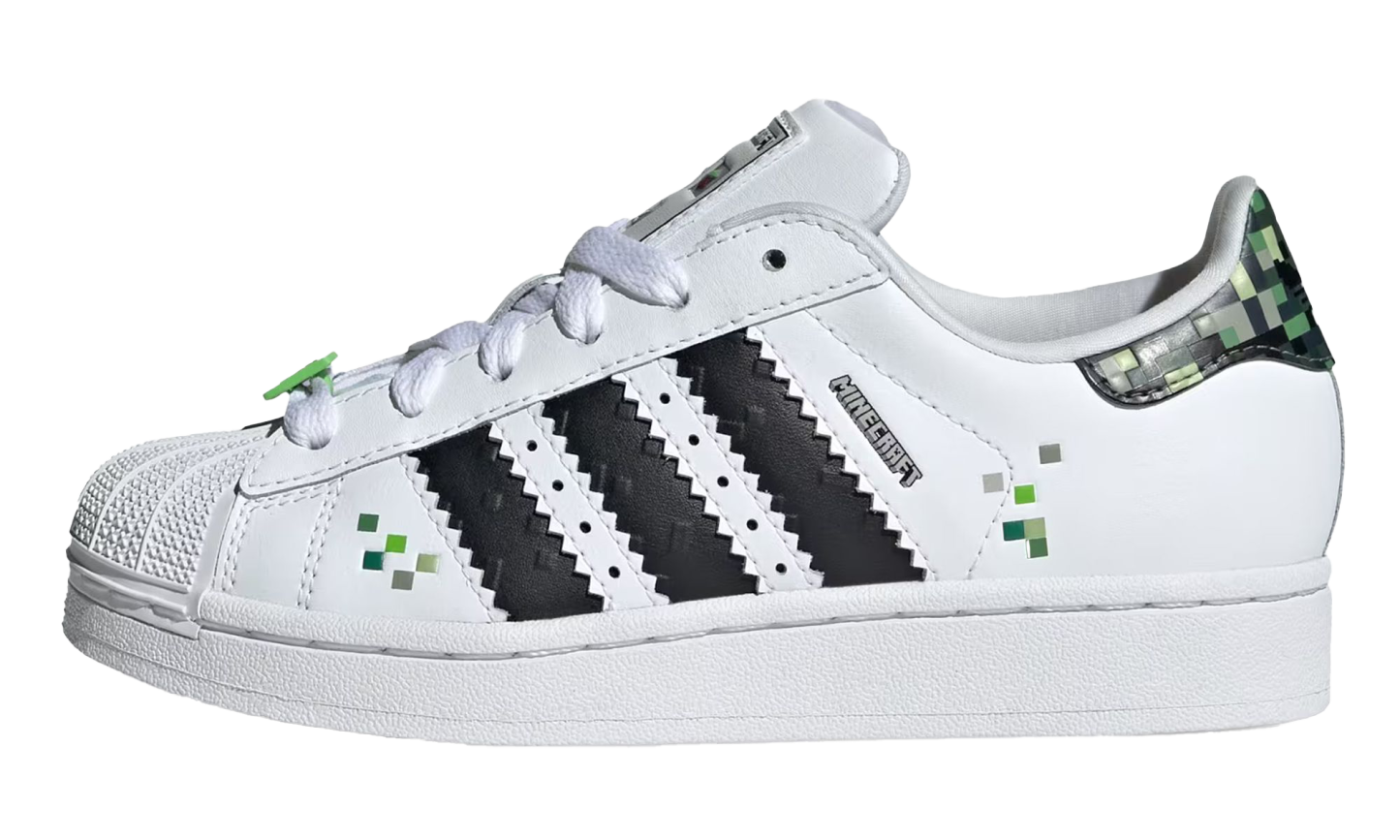 The Superstar GS 'Minecraft - Creeper' shoe features a design inspired by the iconic Minecraft character Creeper, blending classic Adidas Superstar style with unique pixelated details.