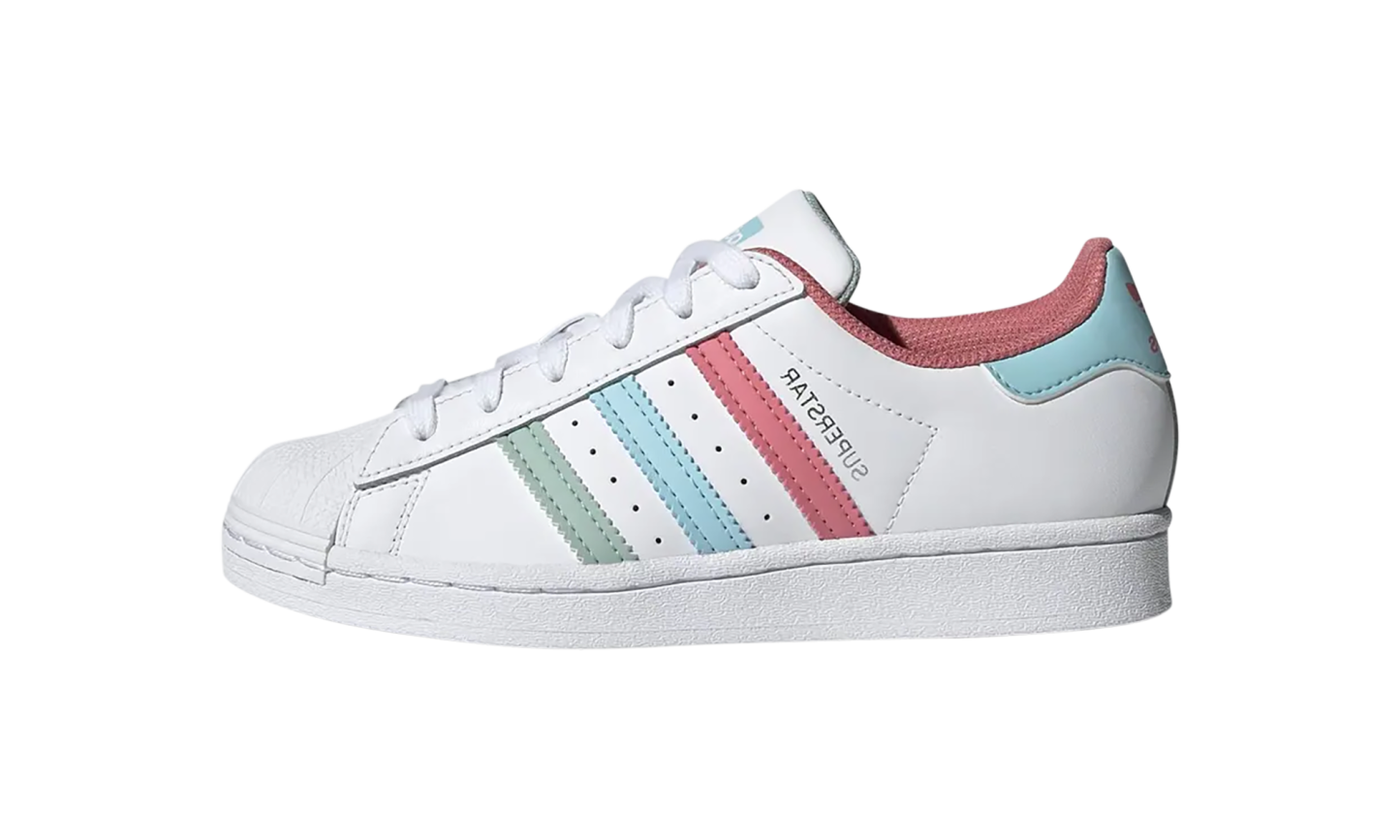 The Superstar GS 'White Hazy Rose Sky' shoe features a classic design with a fresh and vibrant colorway, perfect for adding a playful touch to any sneaker collection.