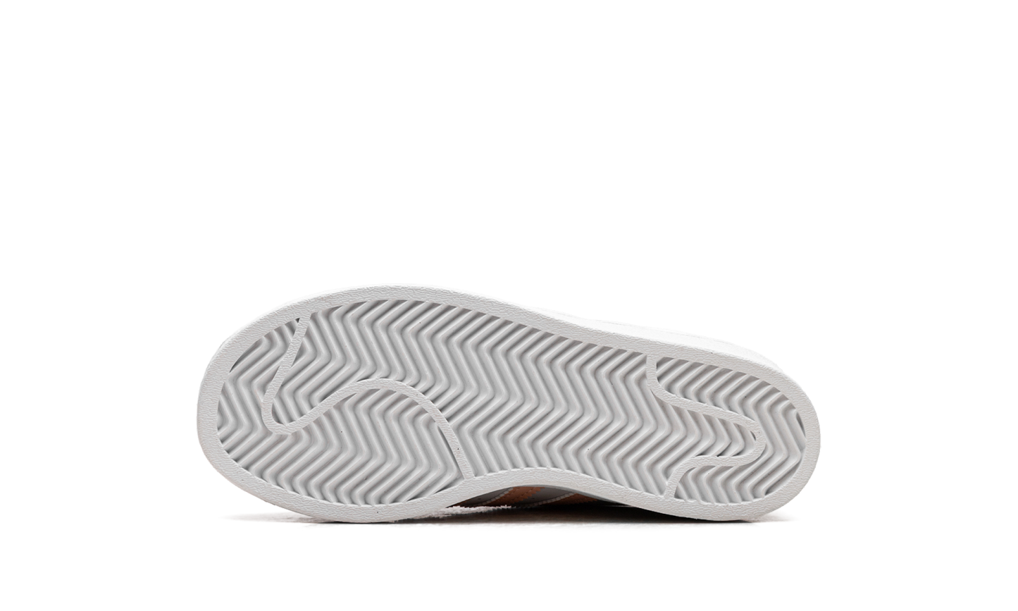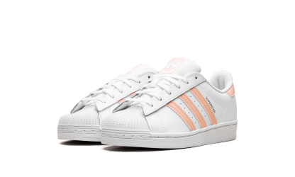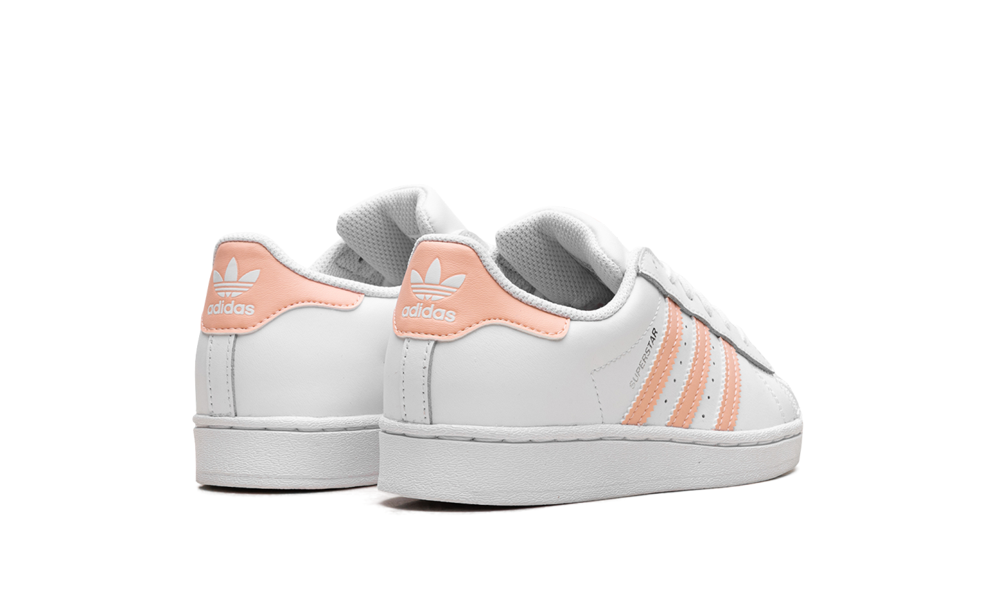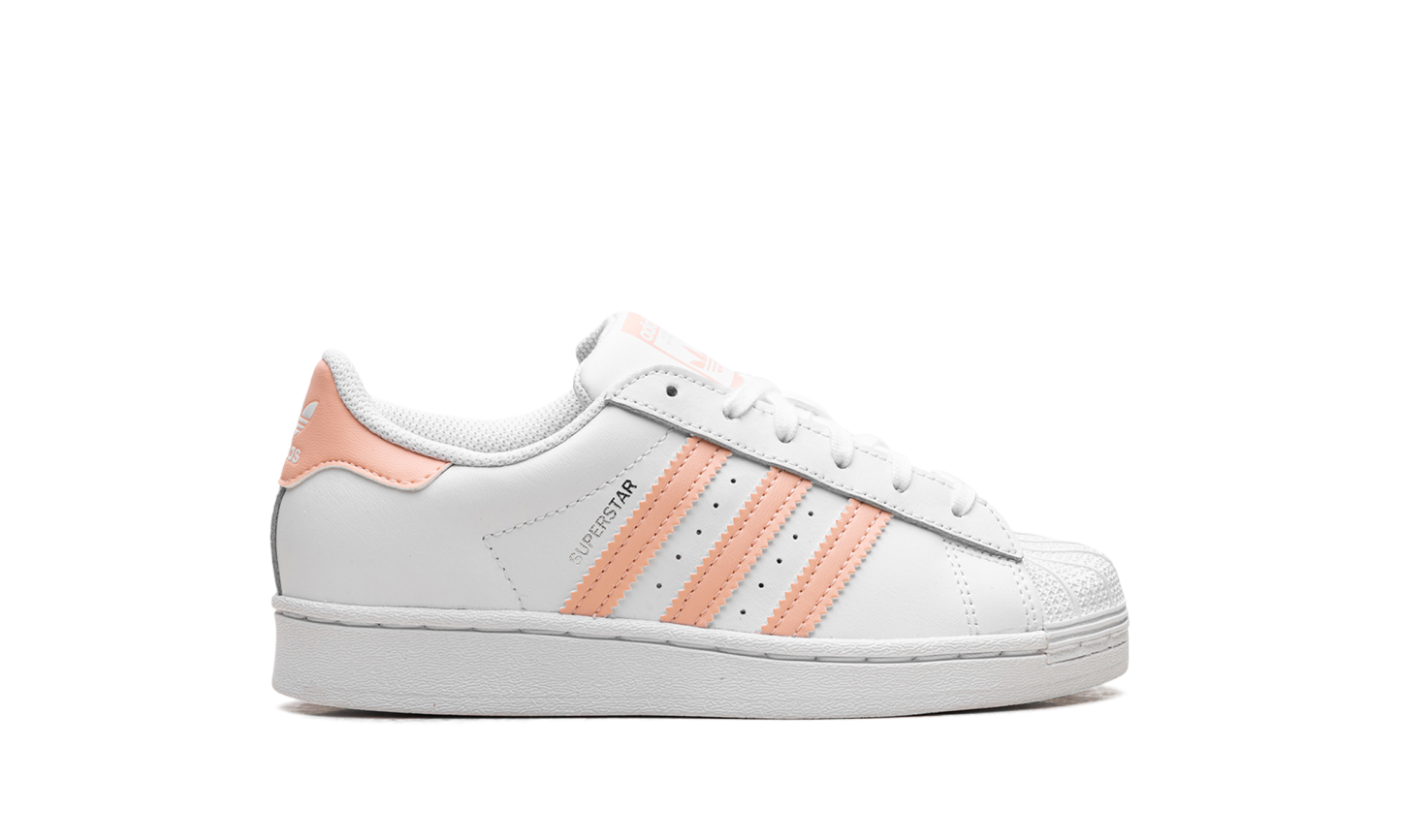 The Superstar 'Haze Coral' shoe features a classic design with a vibrant haze coral colorway, offering a fresh and bold addition to any sneaker collection.