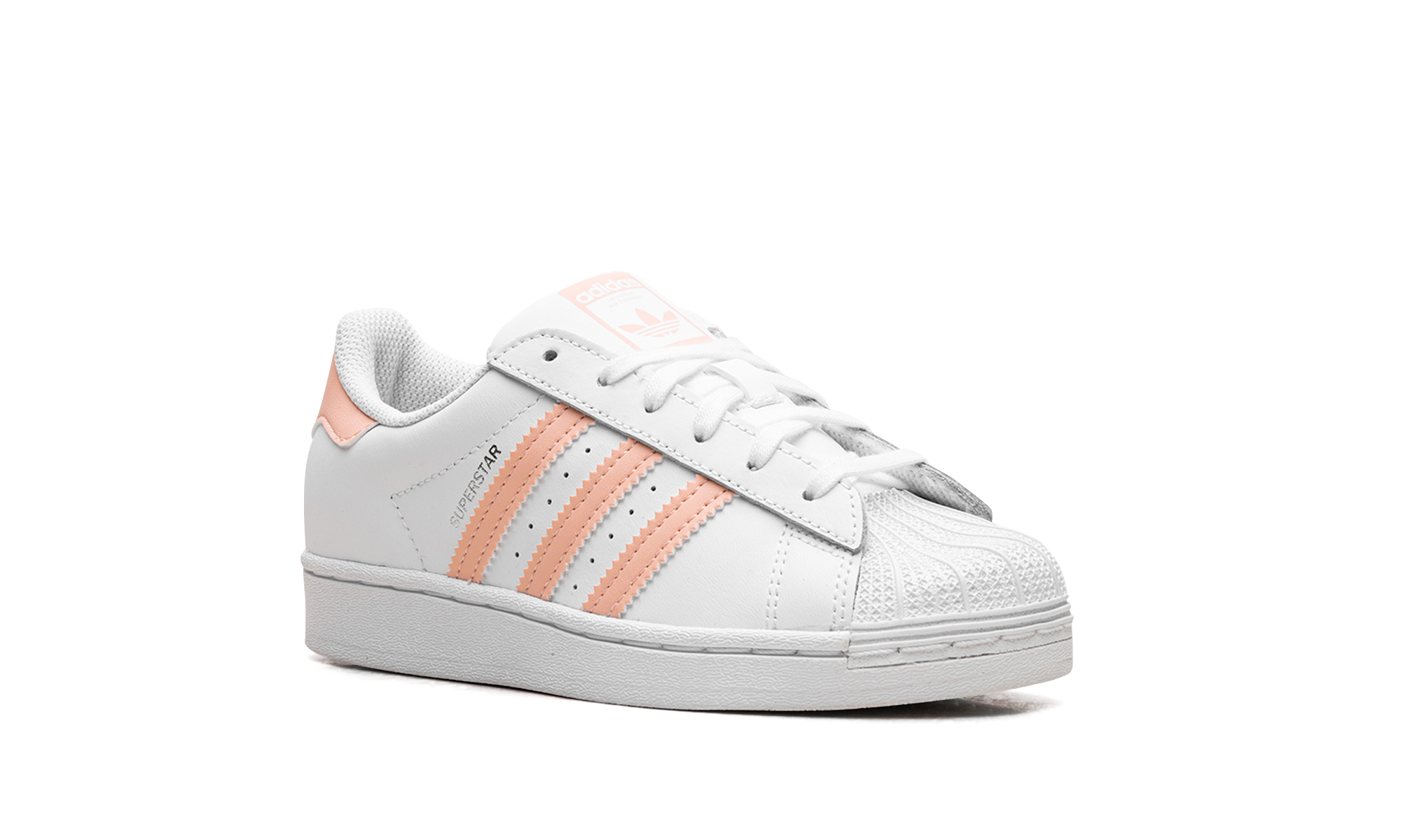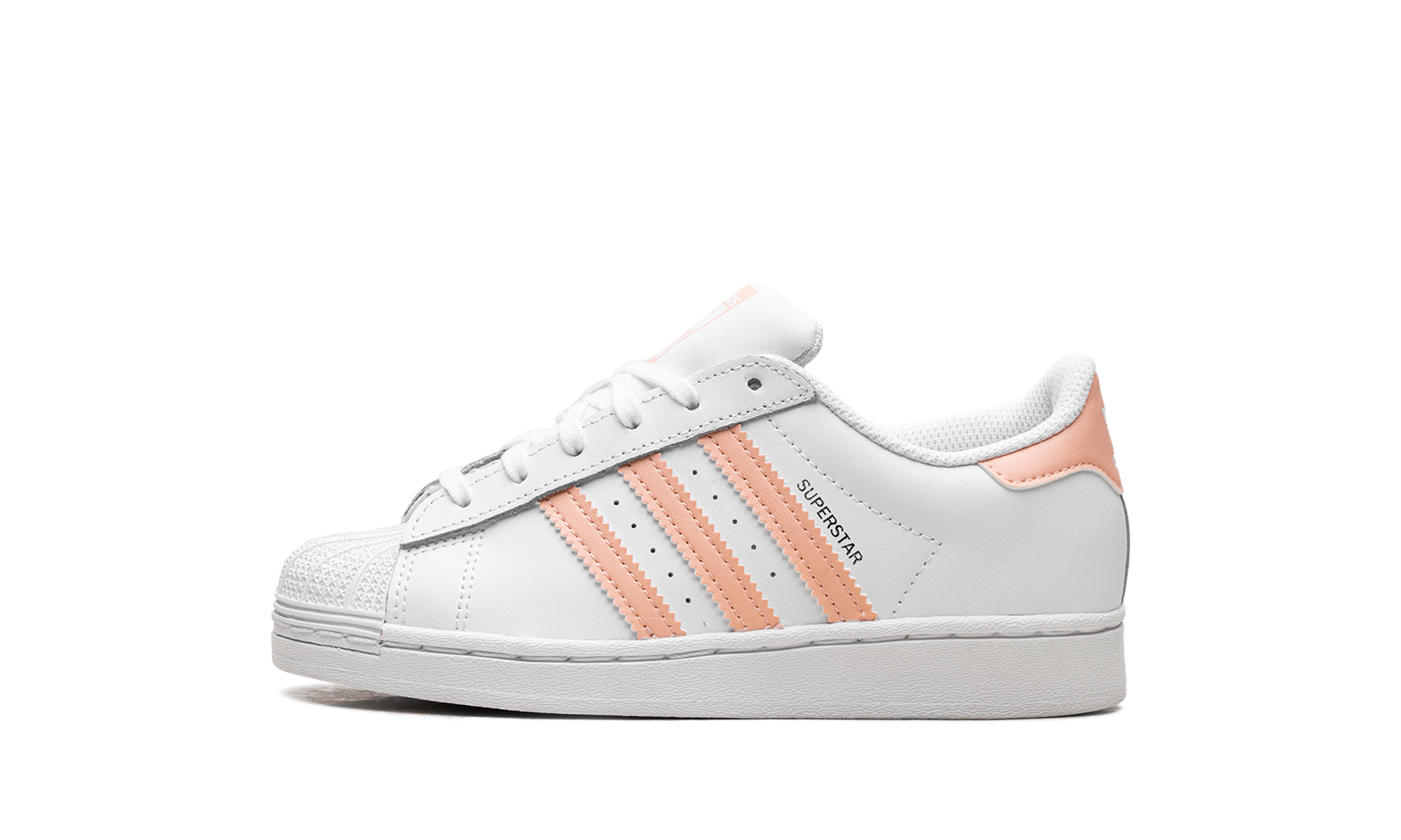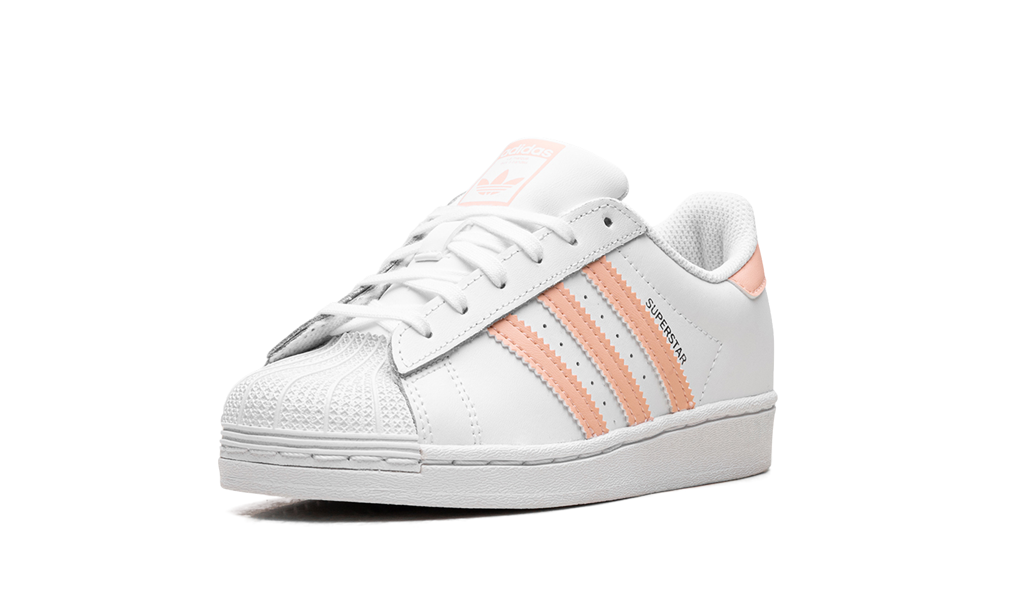 The Superstar 'Haze Coral' shoe features a classic design with a vibrant haze coral colorway, offering a fresh and bold addition to any sneaker collection.
