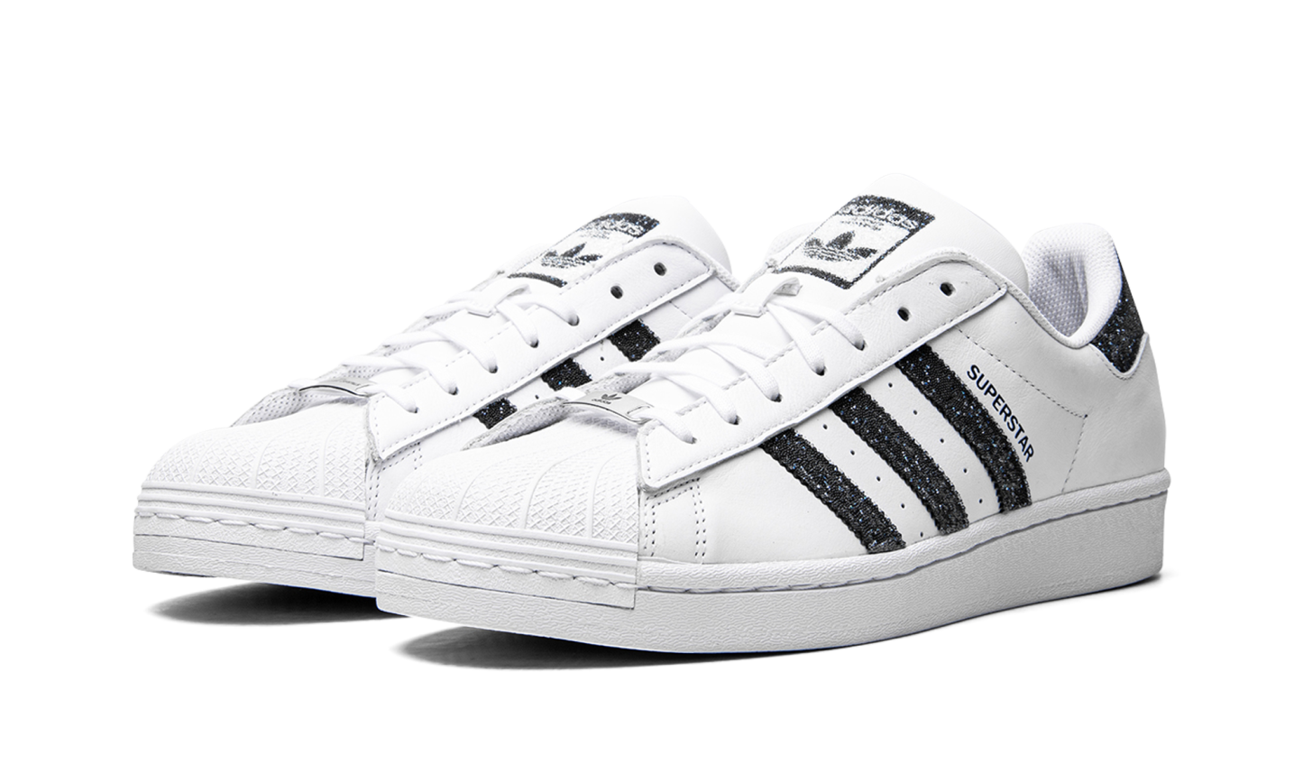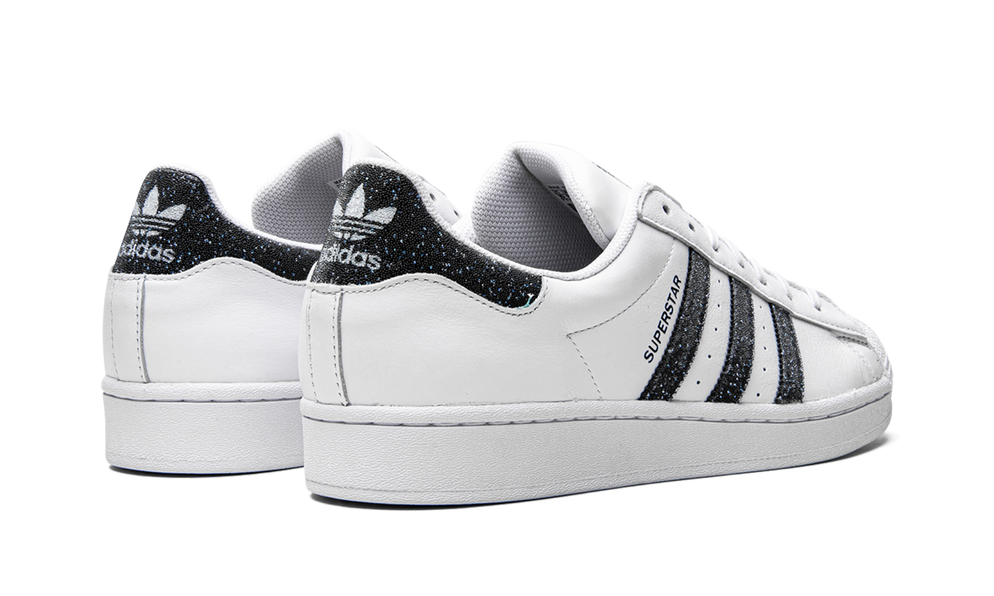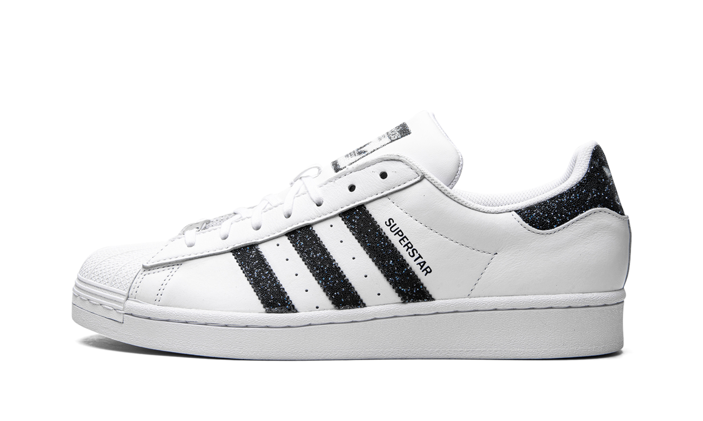 The Superstar I 'Swarovski White Black' shoe features a classic design with dazzling Swarovski crystal details, offering a luxurious and eye-catching twist on the iconic Superstar silhouette.