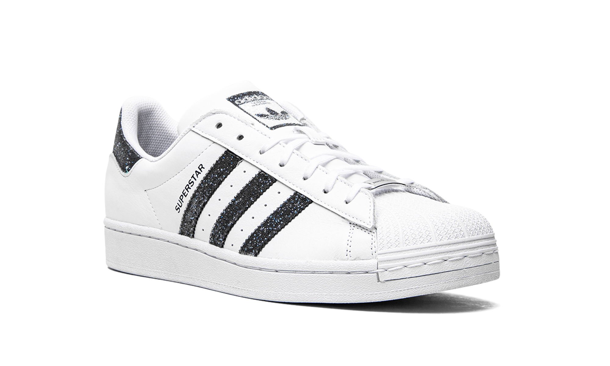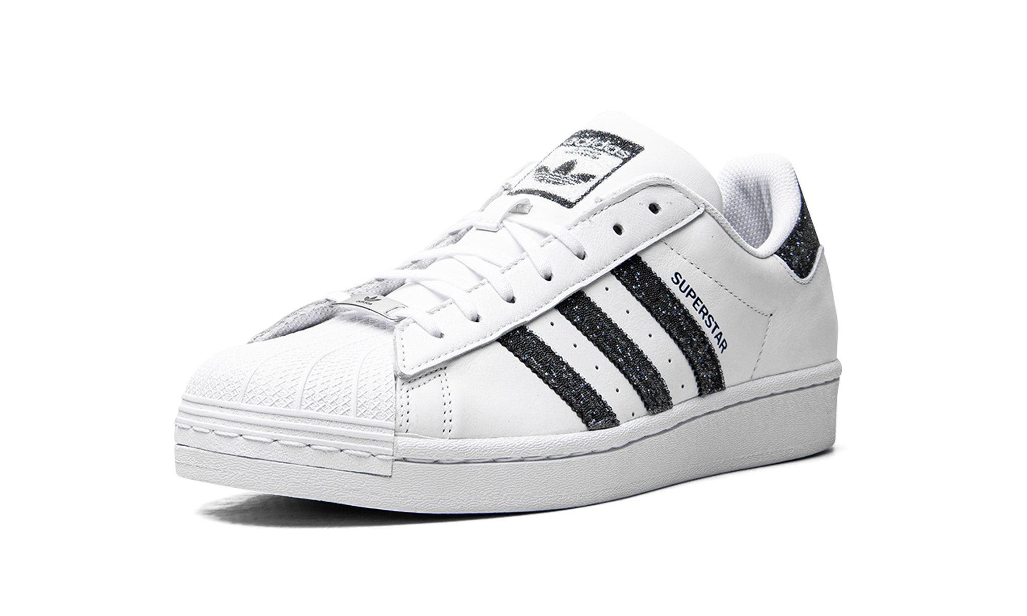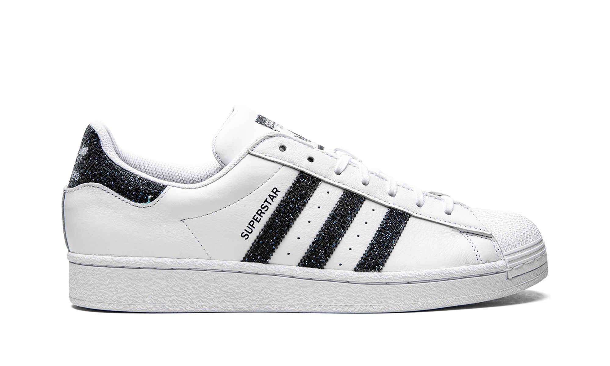 The Superstar I 'Swarovski White Black' shoe features a classic design with dazzling Swarovski crystal details, offering a luxurious and eye-catching twist on the iconic Superstar silhouette.