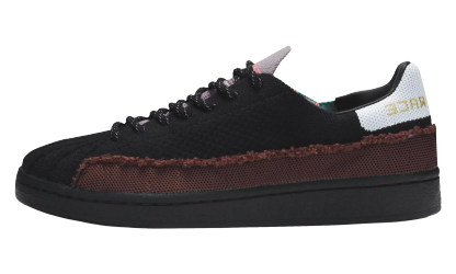 The Superstar 'Pharrell Williams - Patchwork Black' shoe combines classic Adidas Superstar style with a unique patchwork design by Pharrell Williams, featuring a sleek black aesthetic.