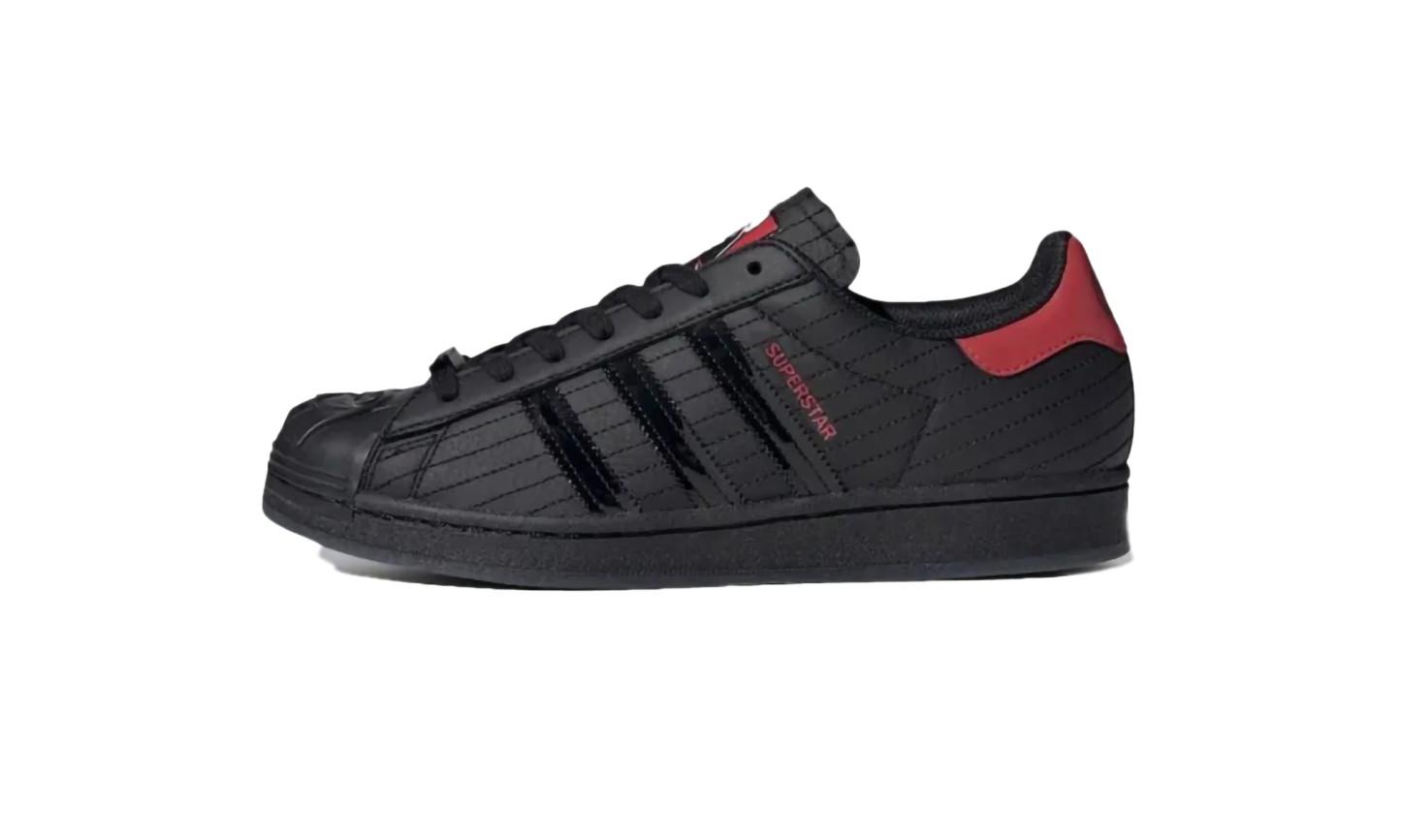 The Superstar 'Star Wars Darth Vader' shoe features a design inspired by the iconic villain, blending classic Adidas Superstar style with unique Star Wars details.