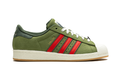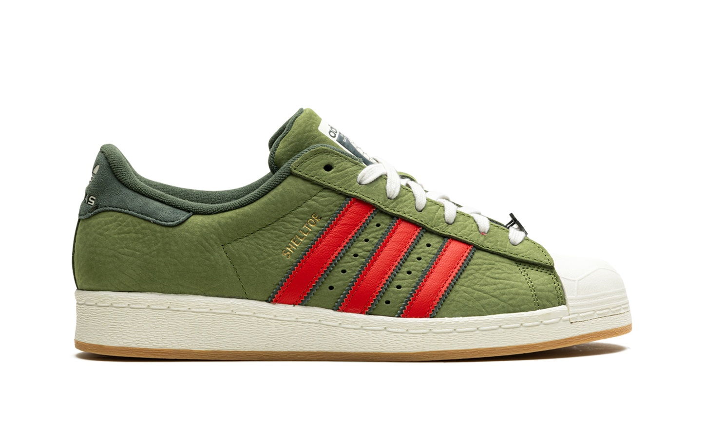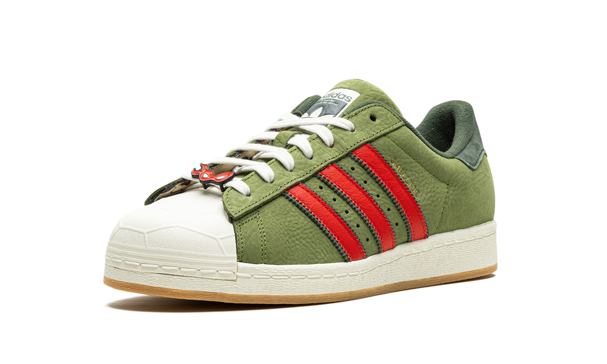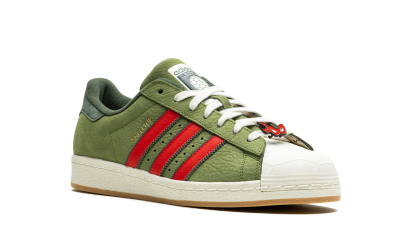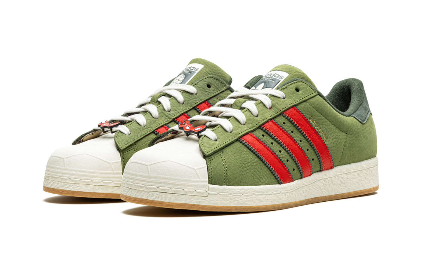 The Superstar 'Teenage Mutant Ninja Turtles - Shelltoes' shoe features a design inspired by the iconic cartoon, blending classic Adidas Superstar style with unique Teenage Mutant Ninja Turtles details on the shell toe.