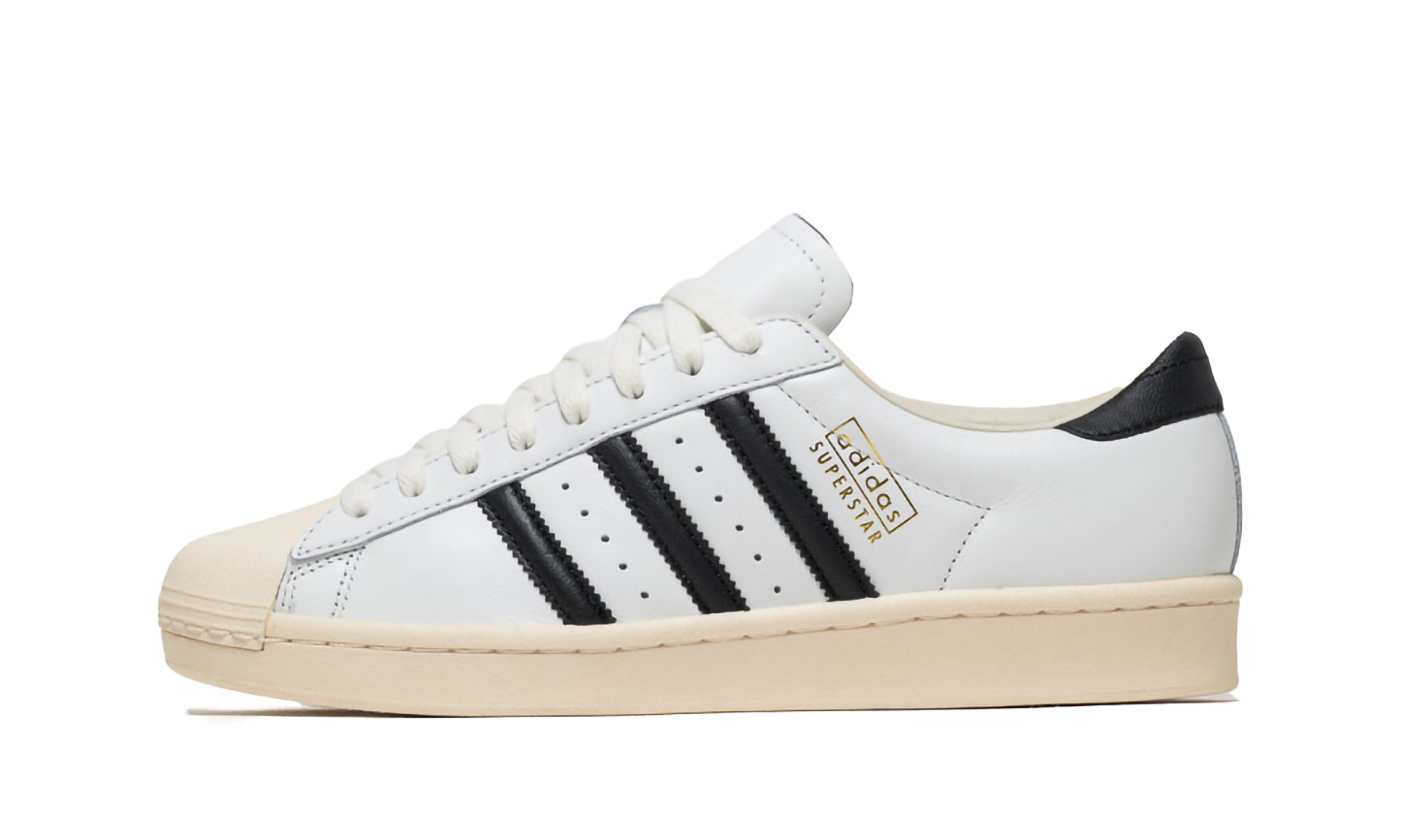 The Superstar Vintage 'White / Black / Antique' shoe features a classic design with a vintage aesthetic, offering a timeless addition to any sneaker collection.