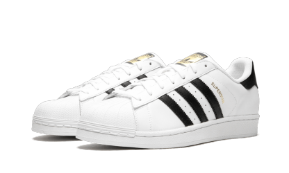 The Superstar 'White/Black/Gold' shoe features a classic design with gold accents, offering a versatile and timeless addition to any sneaker collection.