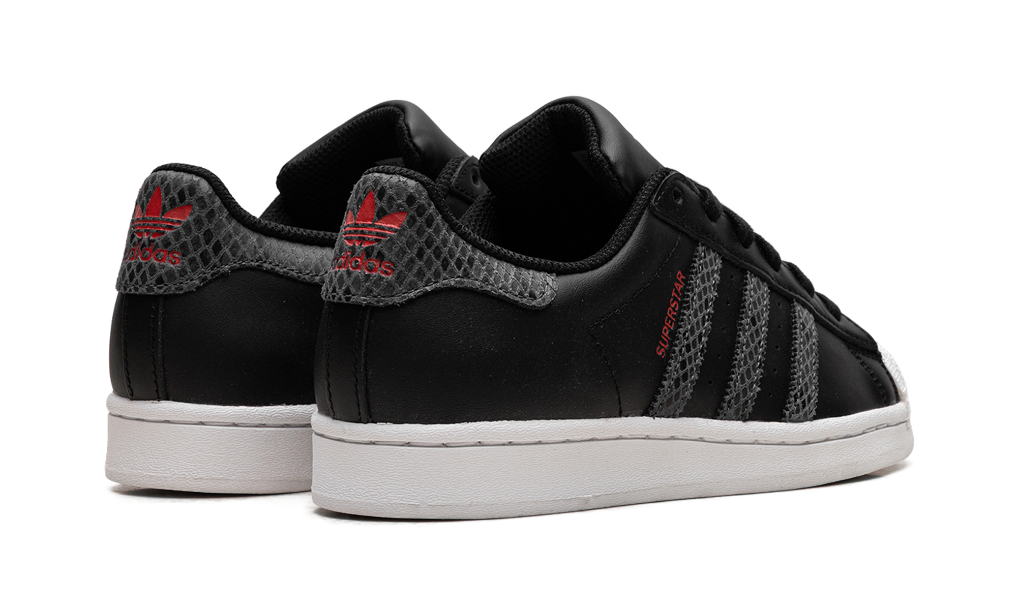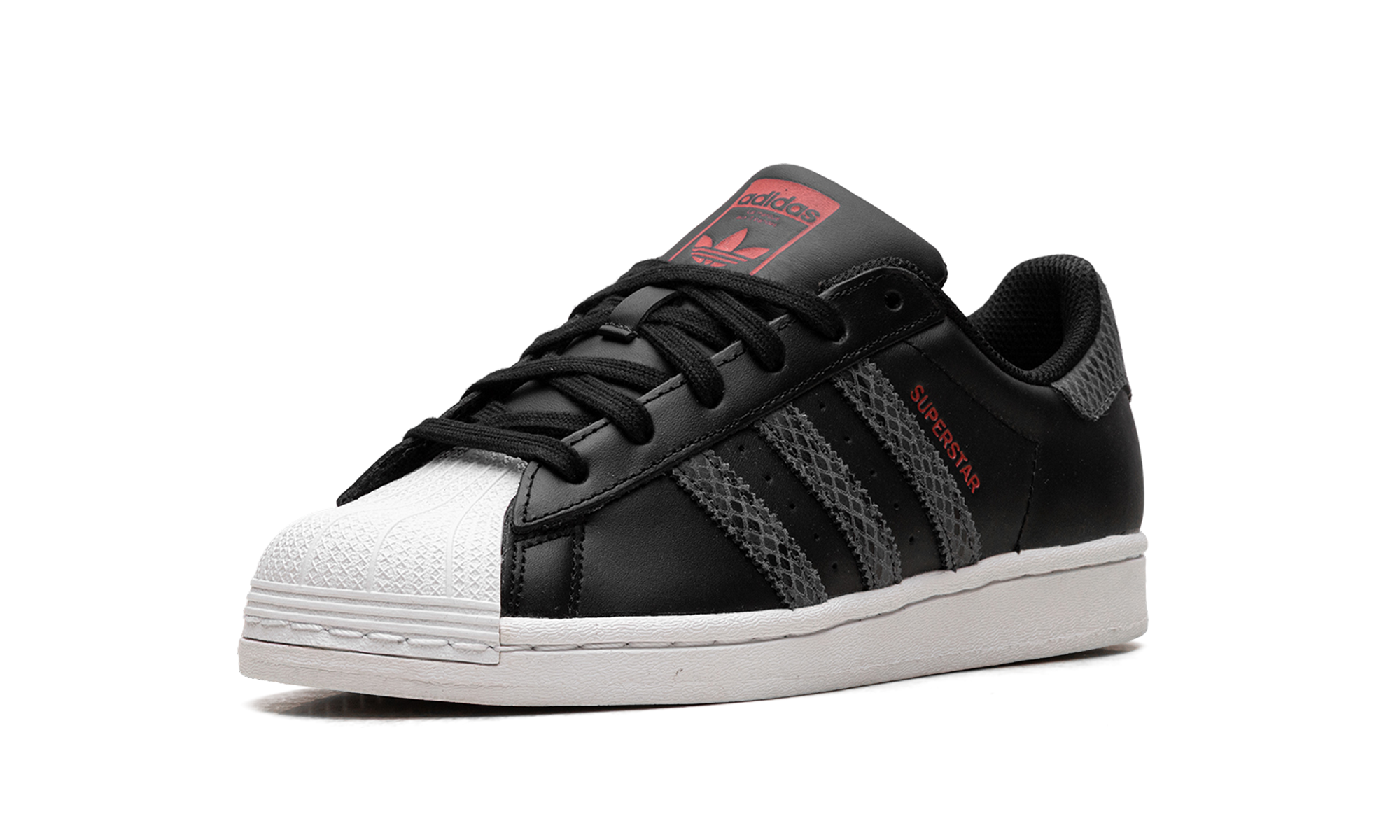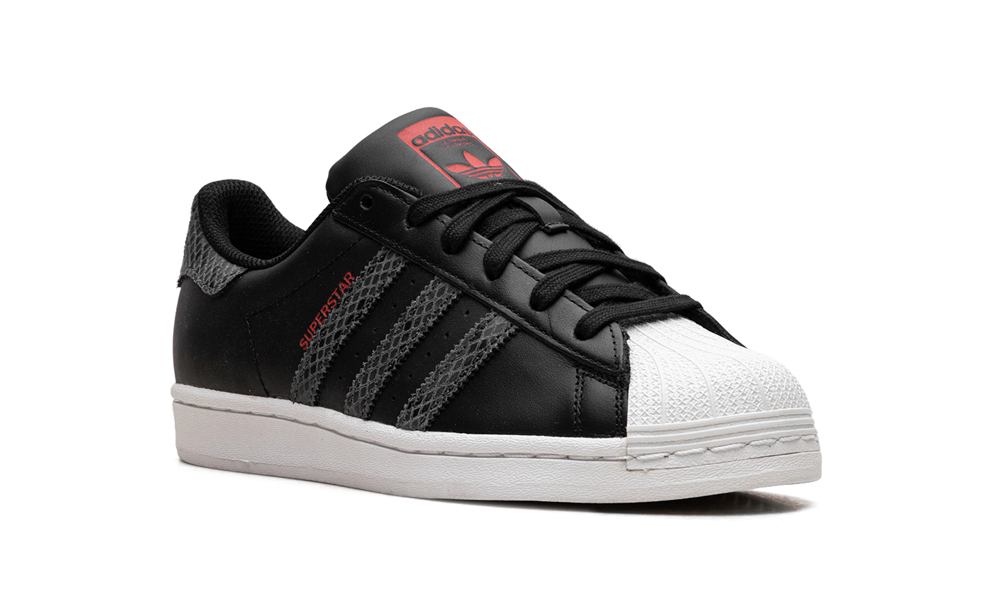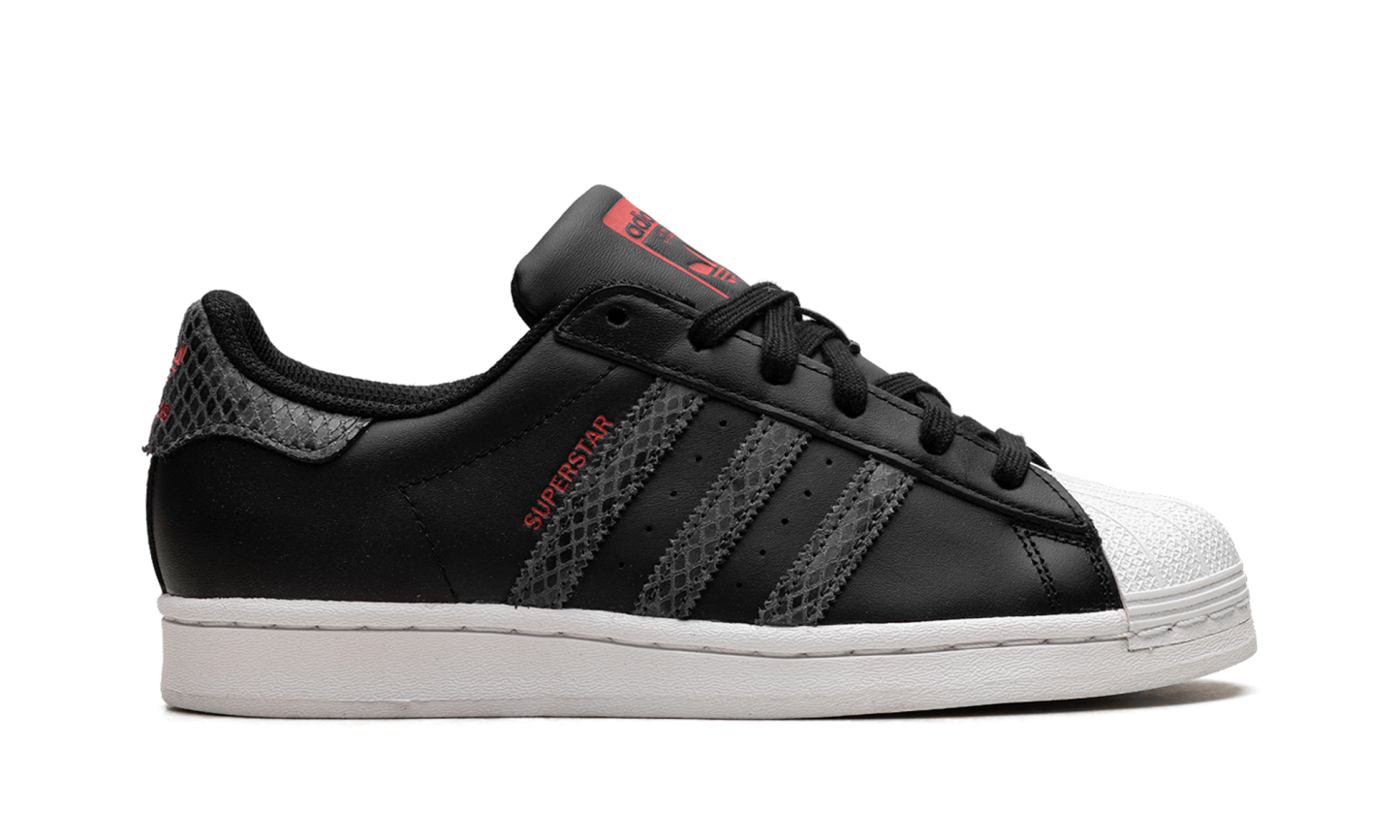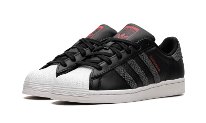 The Superstar WMNS 'Black' shoe features a classic design in an all-black colorway, making it a versatile and timeless addition to any sneaker collection.