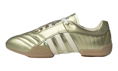 Illuminate your rotation with the opulent, high-octane energy of the Taekwondo Mei Elite "Gold Metallic," a silhouette that masterfully pairs archival martial arts DNA with a bold, luxury finish. This iteration features a premium metallic gold leather upper that radiates a liquid-metal sheen, distinguished by structural quilted stitching at the toe and supportive vertical ribbing along the sidewalls. The high-gloss foundation is sharply contrasted by crisp white three-stripes and matching laces, offering a sophisticated, high-fashion strike to the streamlined profile. Grounded by a split-sole gum rubber outsole that curves up the lateral and medial sides for superior flexibility and grip, these sneakers deliver a premier, "Quiet Luxury" anchor that bridges the gap between heritage performance and runway-ready street style.